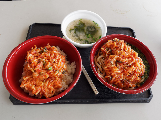 Έχει ένα μαγαζάκι-λυόμενο που πουλάει sakura ebi με κάτι (udon,don,…). Εάν θέλετε κάτι διαφορετικό, όλο το χωριό έχει φαγάδικα με sakura ebi.