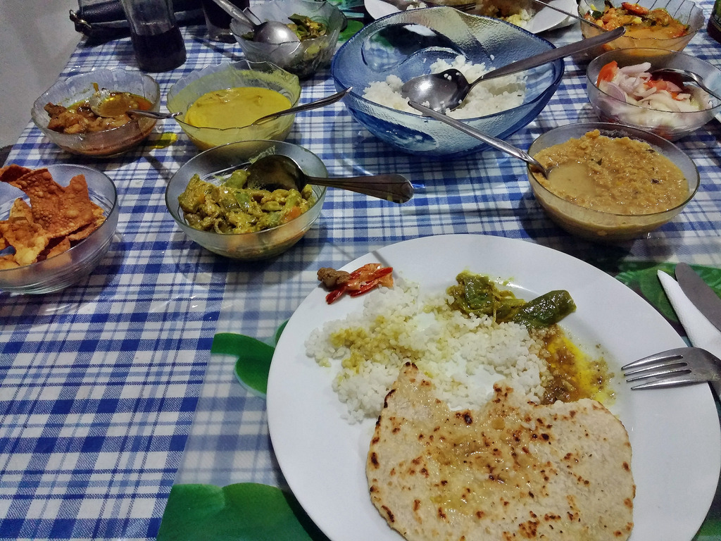 Πεινούσαμε και μας φάνηκε μεγάλη η αναμονή αλλά τι να κάναμε.. Αράξαμε στο δωμάτιο και μετά από 2 ώρες ήρθε να μας φωνάξει. Είχαν ήδη στρώσει το τραπέζι και είχαν φέρει τα curries. Κάποια πιατάκια δεν τα είχαμε ξαναδοκιμάσει ποτέ και μας άρεσαν πολύ, κάποια άλλα πάλι καθόλου, αλλά γενικά χορτάσαμε και δε τα φάγαμε και όλα..