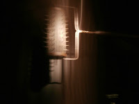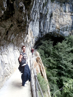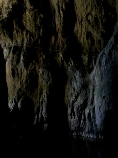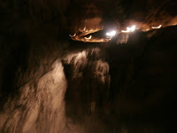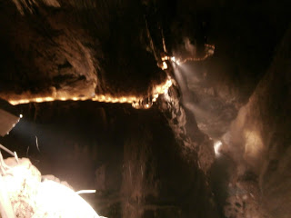 Μετά από μια γρήγορη εισαγωγή για την ιστορία των σπηλαίων και το τι επρόκειτο να δούμε μπήκαμε σε ένα σκοτεινό κατηφορικό διάδρομο και σε λίγα λεπτά βρεθήκαμε στο σπήλαιο. Αρχικά βαδίζαμε σε χώμα και η θέα δεν είχε κάτι το μη γνωστό, κάτι δηλαδή που θα μας έκανε να θαυμάσουμε. Ο οδηγός μας έδειχνε τους χοντρούς σταλακτίτες αλλά εμάς δεν μας έκαναν καμία εντύπωση γνωρίζοντας ήδη τα σπήλαια του Δυρού, τα οποία στο θέμα αυτό ήταν μακράν πάσης, ακόμα και ...υποθέσεως συναγωνισμού (προς το καλύτερο φυσικά). Μετά από 15 περίπου λεπτά όμως περάσαμε στο κυρίως θέμα όπου είναι δύσκολο να επιλεγούν λόγια να περιγράψουν την άγρια ομορφιά του σπηλαίου. Φωτογραφίες απαγορεύονταν με ή χωρίς φλας, κατάφερα όμως να βγάλω μερικές βιαστικές, με μέτριο αποτέλεσμα. Οι φωτεινές γραμμές που βλέπετε είναι τα μονοπάτια όπου περπατούσαμε. Μονοπάτια με στρωμένο δάπεδο και κάγκελα ψηλά. Κάτω από αυτά το βάθος όπου στο τέλος του κυλούσε βουερά ο ποταμός προς την είσοδο του οποίου βαδίζαμε...