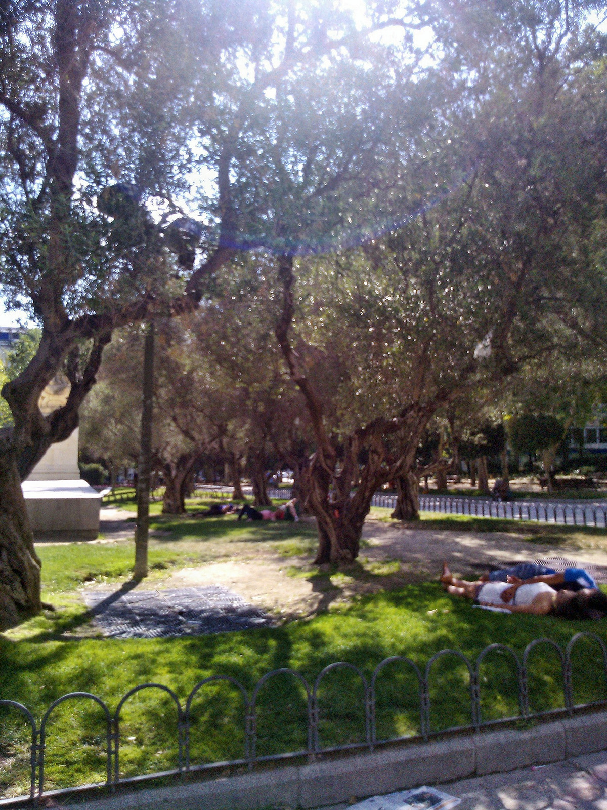 Κάποιοι είχαν ξαπλώσει στην πλατεία και απολάμβαναν τον ήλιο..
