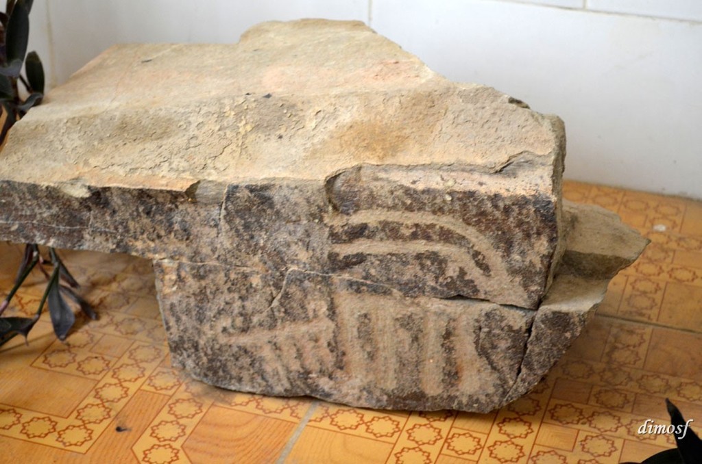 είχε, σε μια άκρη δίπλα στη σκάλα, μια πέτρα με κάποια χαράγματα. Τη βρήκε κάπου στο βουνό και του φαίνεται πως εικονίζει μια κατσίκα (;). Πραγματικά μοιάζει με κάτι τέτοιο, αλλά μάλλον απογοητεύτηκε όταν του είπαμε πως δεν μπορούμε να τον βεβαιώσουμε πως είναι κάτι αρχαίο. Μου έδωσε ένα email να του στείλω τις φωτογραφίες που τράβηξα, κυρίως αυτές με τον μικρό του γιο. Ένας ντροπαλός πιτσιρικάς με υπέροχα μάτια και ένα χαμόγελο που σκότωνε.