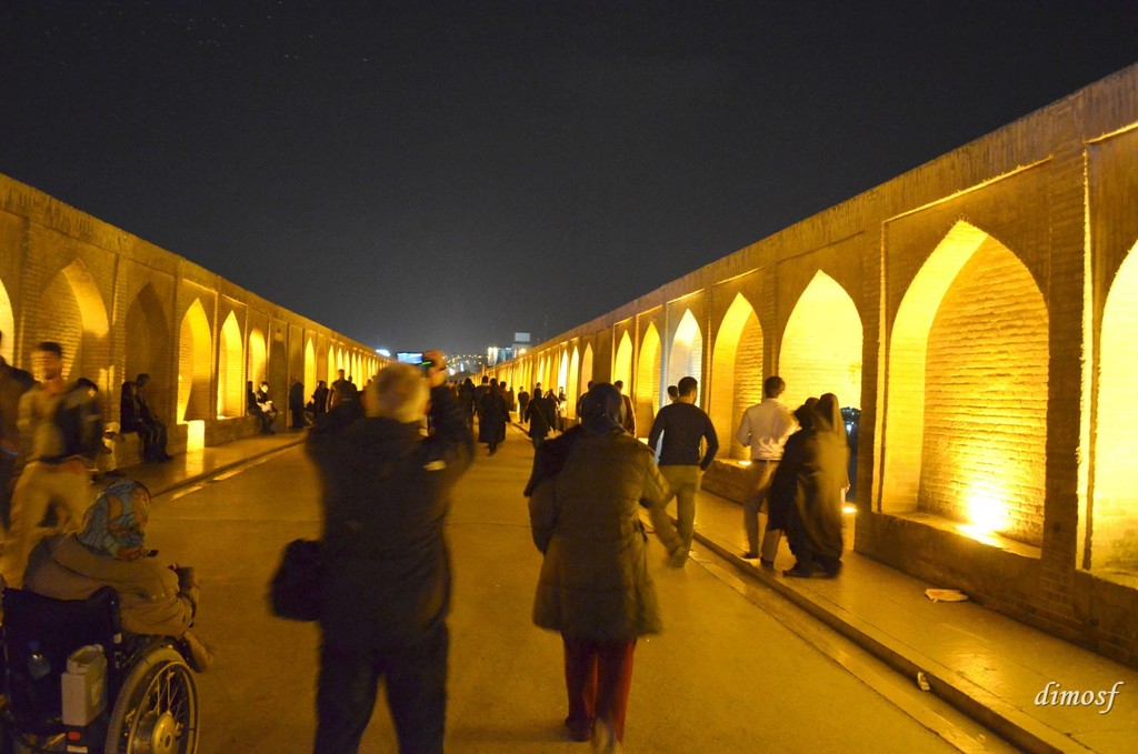καθόταν στα πεζούλια, φλέρταρε (ναι, φλερτάρουν και στο Ιράν, διακριτικά βέβαια) και που και που άκουγες κάποιον να τραγουδάει πολύ παθητικά. Είναι μια συνήθεια σε αυτές τις γέφυρες. Υπάρχει, μάλιστα, κάποια συγκεκριμένη μέρα της εβδομάδας, που γίνεται ένα είδος άτυπου διαγωνισμού τραγουδιού. Ξεκινά κάποιος ένα παθητικό, μακρόσυρτο, ανατολίτικο τραγούδι, το παίρνει στη συνέχεια κάποιος άλλος και πάει κορδόνι. Οι τραγουδιστάδες είναι αραγμένοι μέσα στις καμάρες και τους βλέπει μόνο όποιος είναι σε εκείνο το σημείο. Έτσι ακούς τραγούδι, που έρχεται πότε από εδώ, πότε από εκεί και εσύ απλά απολαμβάνεις. Σκέτη μυσταγωγία!!!