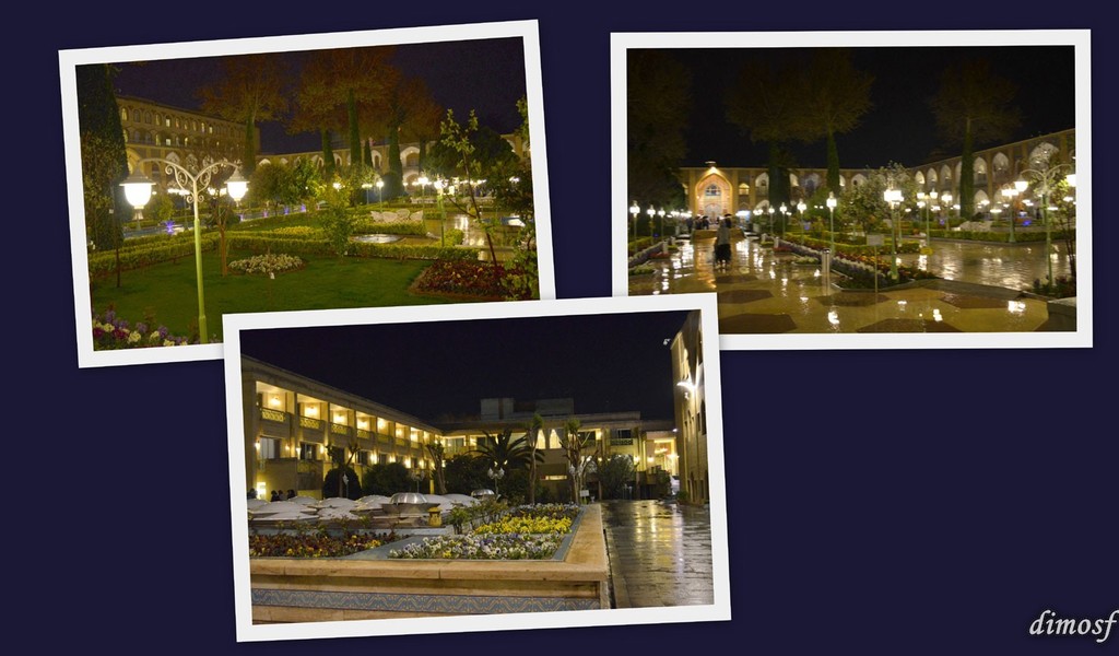 Είχε πέσει η νύχτα σαν μπήκαμε στο Isfahan. Πολλά φώτα, κίνηση και εικόνες μιας μεγάλης πόλης. Το βανάκι μας ξεφόρτωσε στο ξενοδοχείο, πήραμε τα κλειδιά, ανεβήκαμε, φρεσκαριστήκαμε και περίπου μια ώρα μετά κατεβήκαμε στη ρεσεψιόν για να ξεκινήσουμε με την πρώτη, νυχτερινή, γνωριμία της πανέμορφης πόλης. Αλλά αυτά θα τα πούμε σε επόμενο κεφάλαιο. Καληνύχτα από την πόλη, που ονομάσανε «το μισό του κόσμου»!