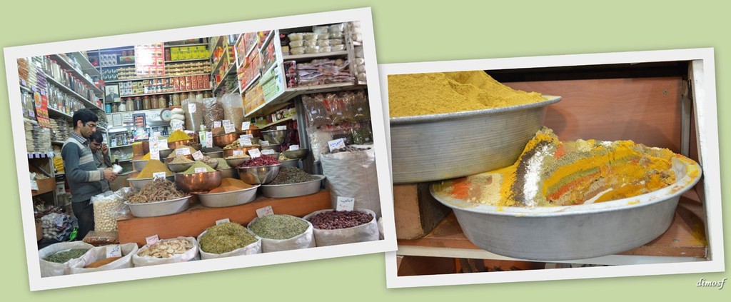 μπαχαρικά. Εκεί είδα και κάτι που είχα δει σε ένα βίντεο. Σε μια λεκάνη στρώνουν διαφόρων ειδών και χρωμάτων μπαχαρικά το ένα πάνω από το άλλο. Ο πωλητής βάζει τη μικρή σέσουλα κάθετα και έτσι παίρνει απ’ όλα, δημιουργώντας ένα μίγμα και αφήνοντας τη λεκάνη με τα μπαχαρικά να σχηματίζουν ένα «βουνό-ουράνιο τόξο». Υπέροχη εικόνα!