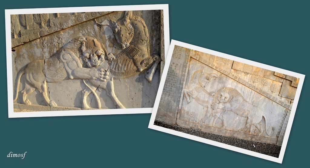 και αυτό του λιονταριού που επιτίθεται στον ταύρο. Διάβασα διάφορες ερμηνείες γι αυτό, όπως πως πρόκειται για τυπικό σύμβολο της βασιλικής δύναμης, ή πως είναι αρχαίο Ζωροαστρικό σύμβολο που δείχνει τον ερχομό του νέου έτους (Νορούζ) που διώχνει τον παλιό. Για να υπάρχει τόσες πολλές φορές μάλλον η πρώτη ερμηνεία μοιάζει πιο ισχυρή.