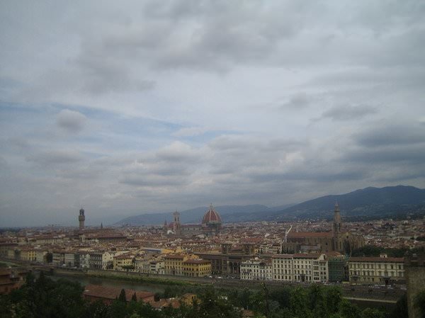 Τελευταία μέρα στη Φλωρεντία. Αποφασίζω να ξεκινήσω τις τελευταίες μου περιπλανήσεις από την Piazzale Michelangelo. Βρίσκεται στα νότια της πόλης σε ένα λόφο, έτσι, καθώς έχει κάποια αποστασούλα και ανηφόρα στο τέλος, προτιμώ να πάω με το λεωφορείο. Από εκεί περνούν δύο λεωφορεία, το 12 και το 13, τα οποία έχουν και αυτά την αφετηρία τους κοντά στo σταθμό της Santa Maria Novella, μετά από παρότρυνση ενός οδηγού όμως παίρνω το 12, το οποίο μού λέει ότι κάνει πιο σύντομη διαδρομή. Η διαδρομή μέχρι ένα σημείο δεν έχει πολύ ενδιαφέρον, καθώς περνάει μέσα από άχαρα προάστια, περνώντας όμως το ποτάμι αρχίζει και βελτιώνεται. Περνάμε από την Πόρτα Σαν Τζόρτζο και μετά από κάποια τείχη. Σε λίγο το τοπίο αρχίζει να αλλάζει... Η περιοχή, αν και όχι ιδιαίτερα μακριά από το ποτάμι και το Ponte Vecchio, σε κάνει να αισθάνεσαι πραγματικά ότι βρίσκεσαι στην εξοχή. Υπέροχο πράσινο, δρομάκια μέσα στη φύση, πάρκα με παγκάκια για την ξεκούραση των Φλωρεντών.