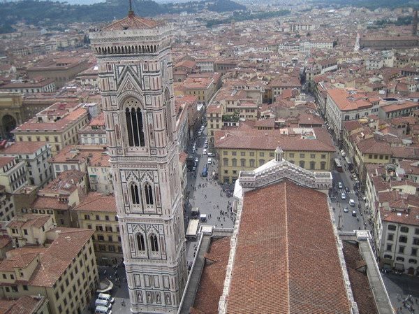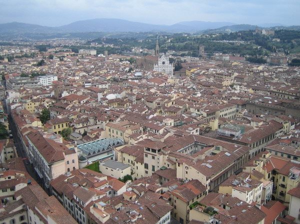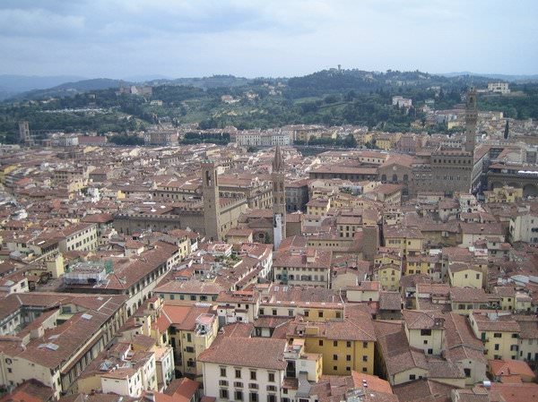 Κατόπιν, αποφασίζουμε να μπούμε... βλέπουμε μια είσοδο... Πόσο πληρώνεις; 8 ευρώ... Δε δίνω και πολλή σημασία, λόγω κούρασης... έτσι κι αλλιώς θέλω να το δω... Τα δίνω... τα δίνει και η φίλη μου... και σε δευτερόλεπτα συνειδητοποιούμε ότι δεν αφορούν την είσοδο στο ναό, αλλά μόνο την ανάβαση στο Dome, το σημείο πάνω από τον τρούλο του, από το οποίο έχεις θέα σε ολόκληρη την πόλη. Εγώ άλλο που δεν ήθελα! Πανοραμική Φλωρεντία από ψηλά... η φίλη μου όμως που είχε ανέβει άλλες 2 φορές, με αγριοκοίταξε, μου είπε «θα μου το πληρώσεις αυτό» και άρχισε να ανεβαίνει αγκομαχώντας τα 463 -παρακαλώ- σκαλοπάτια έως την κορυφή. Με τα πολλά και συζητώντας πώς θα βρούμε τρόπο να το ξεπληρώσω, φτάνουμε, αφού πρώτα περνάμε από κάποια σημεία όπου βλέπεις το εσωτερικό του ναού από ψηλά, αλλά και τον εντυπωσιακό θόλο του Μπρουνελέσκι (επαναστατικό επίτευγμα για την εποχή του το γεγονός ότι έχτισε το θόλο χωρίς να χρησιμοποιήσει καθόλου σκαλωσιές) με τις τοιχογραφίες του Βαζάρι. Φτάνοντας στην κορυφή του θόλου, η θέα από τη βεράντα του είναι πραγματικά μαγευτική. Βέβαια, έχω να σημειώσω κάτι. Νομίζω ότι είναι καλύτερα να ανεβεί κάποιος στο Duomo μετά από κάποιες περιηγήσεις στην πόλη και αφού έχει δει κάποια πράγματα σ’ αυτήν. Βλέπω τώρα τις φωτό και αναγνωρίζω πολλά σημεία... ααα... εδώ το τάδε.. ααα... εκεί το δείνα... Ε, όταν ανέβηκα, έψαχνα στον οδηγό μου να βρω τι είναι τι! Στο τέλος το Duomo λοιπόν...