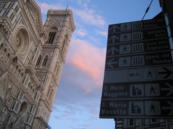 Ώρα για μια πρώτη αναγνώριση της πόλης. Πού να πάμε πρώτα... Στο Duomo, από το οποίο περάσαμε και νωρίτερα, πέφτει η ιδέα. Επιστρέφουμε λοιπόν στον καθεδρικό, ρίχνοντας κάποιες προσεκτικότερες ματιές στο τεράστιο κτίριο, που αποτελεί, όπως προείπα, σήμα-κατατεθέν για το ιστορικό κέντρο της πόλης. Οι μαρμάρινες επενδύσεις του είναι εντυπωσιακές στο μάτι, αν και η υγρασία της πόλης κάνει αισθητή την παρουσία της, με αποτέλεσμα -όσο συχνά και αν υπάρχουν εργασίες καθαρισμού του ναού- να είναι εμφανής. Βγάζουμε κάποιες εξωτερικές φωτογραφίες, τόσο από το ναό, όσο και από το Κωδωνοστάσιο του Giotto (Campanile) αλλά και το κτίριο του Βαπτιστηρίου (Battistero).