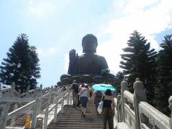 Είναι απίστευτο πόσο γρηγορα περνανε οι μέρες! Η εβδομάδα είχε κυλήσει σαν νερό, και η Κυριακή ήταν η μέρα που θα αφηναμε το Χονγκ Κονγκ για ενα διήμερο στο Ντουμπάι. Η πτηση μας ήταν 00.25πμ ξημερωματα Δευτέρας, οπότε ειχαμε όλη τη μερα στη διαθεση μας. Σηκωθηκαμε με την ησυχία μας, πήραμε πρωινό, και αφήσαμε το ξενοδοχείο κατα της 10. Η μέρα ήταν ηλιόλουστη, η πιο καθαρή μερα απ’όλες. Το πρόγραμμα έλεγε, να αφήσουμε τις αποσκευές στο αεροδρόμιο και να επισκεφτούμε το άγαλμα του Μεγαλου Βούδα και το μοναστηρι Po Lin που βρισκονται στο Ngong Ping, στο νησι Lantau, αρκετα κοντα με το αεροδρομιο. Το ταξι μας άφησε εξω απο το terminal 1 και περπατησαμε μεχρι το terminal 2 όπου τελικά ειναι ο χωρος φύλαξης αποσκευων. Για καθε αποσκευη χρεώνουν 10 δολλαρια Χονγκ Κονγκ ( δηλαδη περιπου 1 ευρω) την ώρα. Αφήσαμε τις βαλιτσες μας, και βγηκαμε έξω να περιμενουμε ταξι. Ο καλύτερος τροπος να ανεβεις στο σημείο που ειναι ο Βούδας ειναι το τελεφερικ απο την πολη Tung Chung (στην οποια μπορεις να πας με λεωφορείο απο το αεροδρόμιο σε 10 λεπτα. Δυστυχως όμως για μας το τελεφερικ δεν λειτουργουσε τις μερες που ειμασταν εμεις εκει, οπότε για λιγοτερη ταλαιπωρια για μας, προτιμήσαμε το ταξι. Και λέω δυστυχώς, γιατι το Ngong Ping 360 ήταν κάτι που ήθελα πολύ να κάνω. Η διαδρομή των σχεδόν 6 χιλιομέτρων και 25 λεπτων απο το Tung Chung εως τον Βούδα πρεπει να ειναι μαγική, καθώς μπορεις να απολάυσεις την πανεμορφη φυση του Lantau, θέαμα πολύ διαφορετικό απο τη φασαρια και πολυκοσμια του Χονγκ Κονγκ. http://www.np360.com.hk/html/eng/front/index.asp . Αλλά και η διαδρομή με το ταξι δεν μας απογοήτευσε. Μετα απο αρκετη αναμονη για το μπλε ταξι που θα μας ανεβαζε στο βουνό, μετα απο 30+ λεπτά διαδρομής με εναν ταξιτζή που νομιζε ότι ήταν ο Σουμάχερ, και δεν ήξερε τι σημαινει φρενο, φτάσαμε στον προορισμο μας. Το κοστος 180 δολλάρια ΧΚ. Το τεράστιο πάρκινγκ ειχε αρκετα πουλμαν και αυτοκινητα παρκαρισμενα οποτε καταλάβαμε ότι θα συναντουσαμε κοσμο. Μπαινοντας στο χωριό που εχουν φτιαξει ασφαλως για τουριστικους λογους, ειδαμε το άγαλμα στα δεξιά μας. Η πραγματική ονομασια του αγάλματος ειναι Tian Tan Buddha, και ονομαστηκε ετσι γιατι κάθεται πάνω σε ενα αντιγραφο του Γήινου Όρους του Tian Tan, πανω στο οποιο βρισκεται ο Ναός του Ουρανου στο Πεκίνο. Προχωρώντας προς το άγαλμα, περάσαμε δυο επιβλητικες εισόδους,