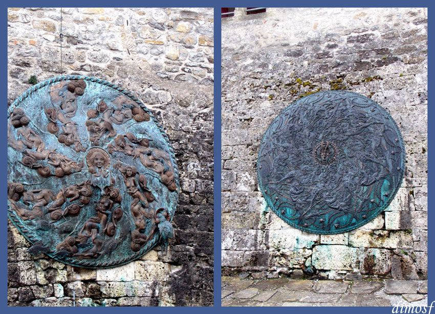 Δεξιά και αριστερά της πύλης υπάρχουν δύο γλυπτά σαν υπερφυσικές ασπίδες με παραστάσεις παραμυθένιων όντων.