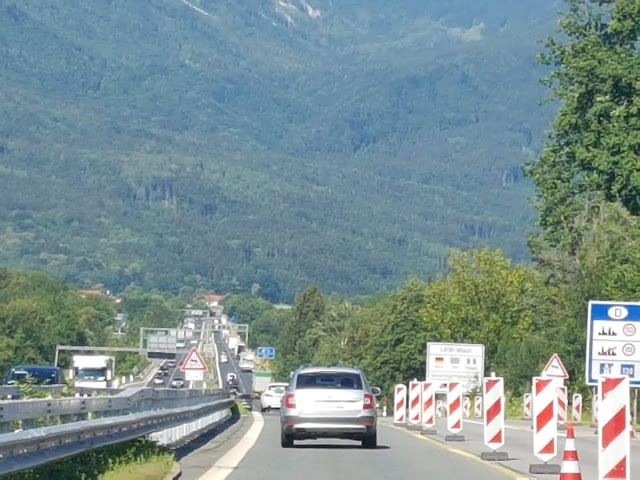 Μπαίνοντας στη Γερμανία επίσης έχει πολύ κίνηση .Περάσαμε το τελωνείο χωρίς κανένα έλεγχο με καθυστέρηση όμως λόγω κίνησης.Για Μόναχο θέλουμε ακόμα 120km αλλά με το που απομακρυνθήκαμε από το τελωνείο,σταματήσαμε γιατί πέσαμε σε μποτιλιάρισμα.Δεν μας πείραξε πολύ γιατί είχε πολύ όμορφα τοπία.Η καθυστέρηση κράτησε 20 λεπτά και ήταν λόγω έργων. Φτάνοντας στο Μόναχο παρατηρήσαμε ότι δεν υπάρχουν διόδια και η τιμη της βενζίνης είναι 1,56 ευρώ.