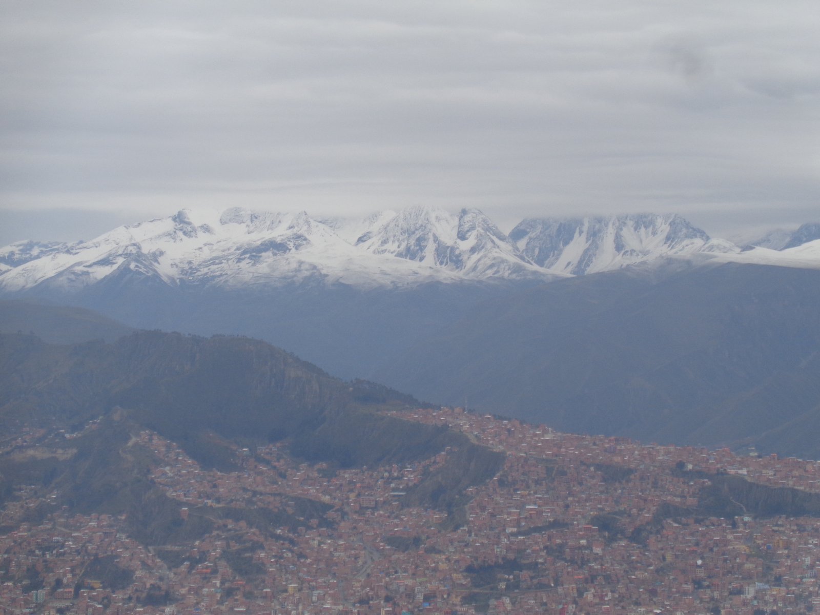 Ο ταξιτζής είναι άγγλος στην ώρα του, φορτώνω μπαγκάζια και βουρ για το αεροδρόμιο του Ελ Άλτο, στα 4050μ., εκεί που μεγάλα αεροπλάνα δε μπορούν να προσγειωθούν και να απογειωθούν ακριβώς λόγω της χαμηλής ατμοσφαιρικής πίεσης. Ανεβαίνοντας τους φιδογυριστούς δρόμους προς τις φτωχογειτονιές της Λα Παζ, γίνεται ορατό από το τζάμι μου το αντικείμενο του πόθου: ΒΟΥΝΑ! Φτάνοντας ψηλά, κάνουμε μια μικρή στάση όπου, επιτέλους, οι αιώνιες χιονοσκέπαστες, μεγαλειώδεις κορυφές των Άνδεων ξεπροβάλλουν γύρω από τη πόλη. Μυθικές κορυφές όπως το Illimani και το Huayna Potosi, που φτάνουν το δυσθεώρητο ύψος των 6500μ. λάμπουν στα μάτια μου, ενώ τρυπάνε τα σύννεφα και φτάνουν ψηλότερα από αυτά. Οι Άνδεις, η υψηλότερη οροσειρά του κόσμου μετά τα βουνά της κεντρικής Ασίας (Ιμαλάια, Καρακορουμ κτλ) και σίγουρα η μακρύτερη.