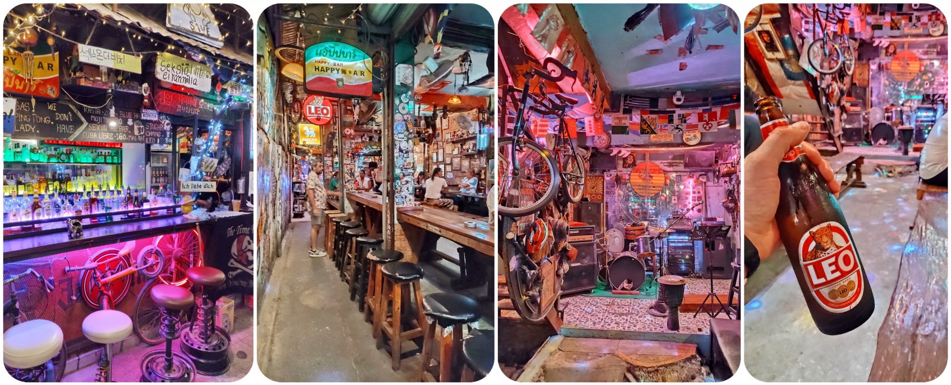 Πόσο ν’ αντέξουμε σε όλο αυτό το χάος; Ήταν αδύνατο, έτσι αφού βρήκαμε ένα ανταλλακτήριο ώστε να αποκτήσουμε τα πρώτα μας τοπικά χρήματα, στρίψαμε γρήγορα σ’ ένα στενάκι που βρήκαμε μπροστά μας, ανακαλύπτοντας με χαρά το «Happy Bar» όπου δε χρειάστηκε πολλή σκέψη προκειμένου να κάνουμε στάση. Νομίζαμε ότι είναι ιδέα μας πως μυρίζουμε συνεχώς χόρτο, μέχρι που ήρθε ο πίτα στη μαστούρα φτιαγμένος ημίγυμνος όπως όλοι σερβιτόρος με το μπαφίδι στο χέρι να μας το επιβεβαιώσει και να μας φέρει πιούμε τις πρώτες LEO, καλωσορίζοντας τους εαυτούς μας στην πόλη. Καταπληκτικό μπαρ, κι ακόμα καλύτερες μουσικές: