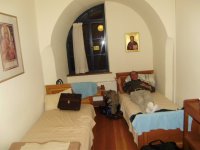 Ο νεαρός λαϊκός δεν προλάβαινε να φτιάχνει καφέδες σε όλο αυτό το πλήθος. Μπήκα στο κουζινάκι βρήκα ζεστό νερό κι έκανα τα τσαγάκια μας που κράταγα μαζί μου σε φακελάκια. Τελικά μας τακτοποίησαν σ ένα δίχωρο κελί, το πρώτο δωμάτιο με δυο κρεβάτια ήταν πιασμένα από Έλληνες και στο δεύτερο μας περίμεναν τρία κρεβάτια καλοστρωμένα, καθαρά, με πετσέτες και παντοφλίτσες Ηλεκτρικές λάμπες υπήρχαν εννοείται… Τα μπάνια ήταν κοινά αλλά καθαρά, ανακάλυψα και μια ντουζιέρα καθαρότατη με καινούργια πλακάκια, ζεστό νερό και ένα μπουκάλι αφρόλουτρο…