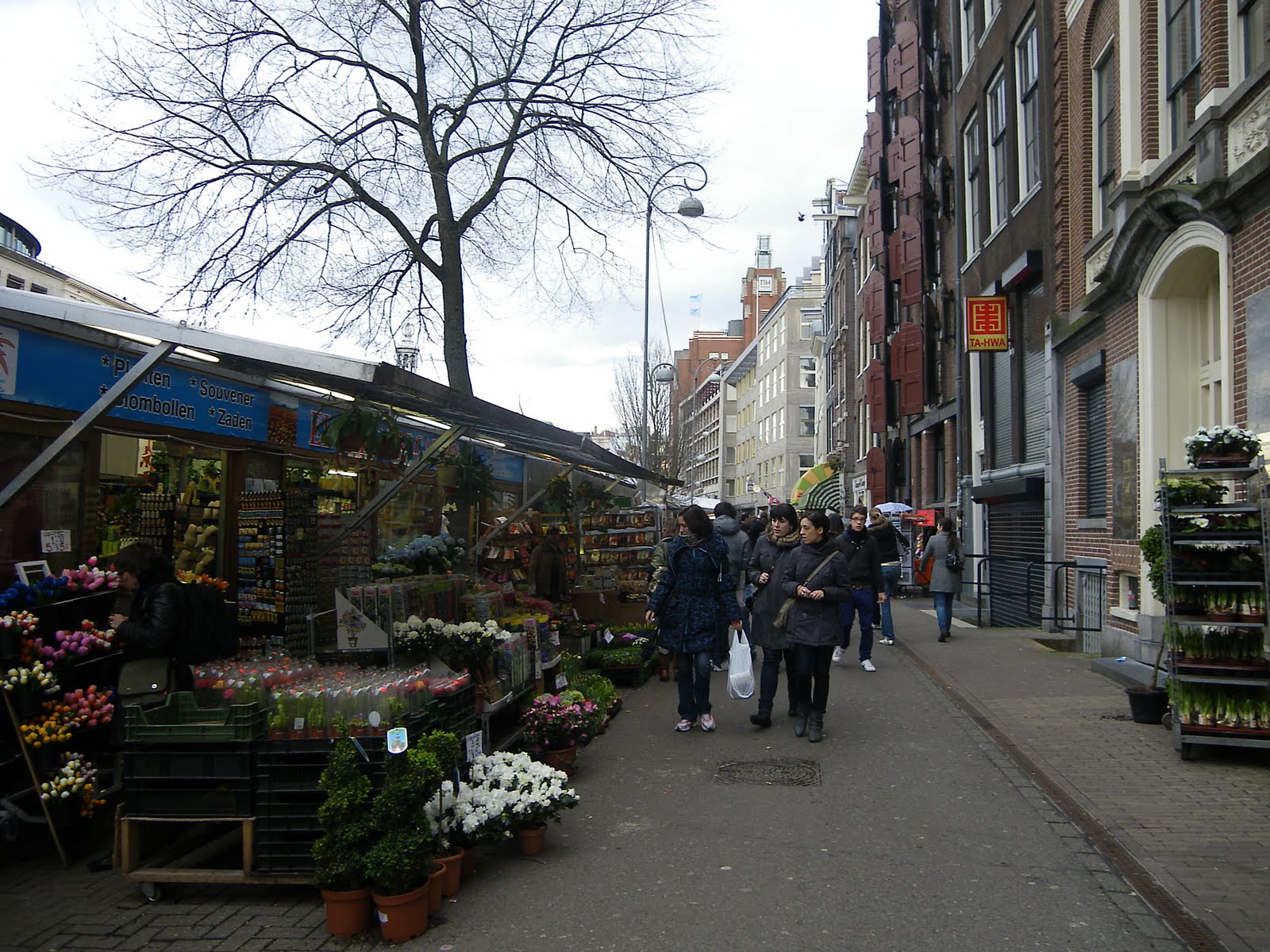Γυρνώντας λίγο πρός τα πίσω οδό Singel και πηγαίνοντας προς τα δεξιά βρίσκεστε στην Bloemenmarkt,την περίφημη αγορά των λουλουδιών!!Εκεί κατακλύζεστε από αρώματα,χρώματα λουλουδιών..μαγεία!Τριγύρω οι εμπορικοί δρόμοι Rokin και Κalvestraat ...χαμός..συνεχίζετε αριστερά πρός πλατεία Dam και είστε στην καρδιά της πόλης!Μεγάλη πλατεία με το Βασιλικό Παλάτι να δεσπόζει προς τα αριστερά(η πρόσοψη του ήταν καλυμμένη λόγω εργασιών)και το εθνικό μνημείο πρός τα δεξιά ,έναν οβελίσκο προς τιμή των Ολλανδών που σκοτώθηκαν στον δεύτερο παγκόσμιο πόλεμο.
