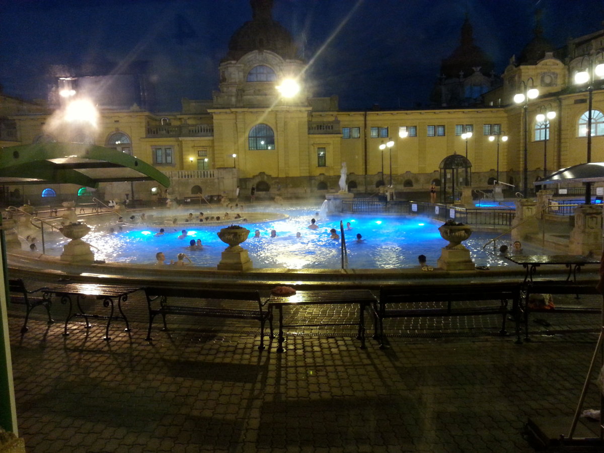 Στη συνέχεια πήγαμε στα λουτρά (Szechenyi Baths). Από την είσοδο που βρίσκεται στην πλευρά του ζωολογικού κήπου μπορείς να βγάλεις ημερήσιο εισιτήριο με περίπου 5000 φιορίνια (με καμπίνα) ή με περίπου 4500 φιορίνια (χωρίς καμπίνα) το οποίο σου δίνει πρόσβαση στις εσωτερικές πισίνες μέχρι τις 19:00 και στις εξωτερικές μέχρι τις 22:00. Οι εσωτερικές πισίνες είναι στην απέναντι πλευρά και μπορείς να πας και από την απέναντι είσοδο στην οποία μπορείς να βγάλεις μόνο εισιτήριο για τις εσωτερικές πισίνες (έως τις 19:00 δηλαδή) με 4500 φιορίνια. Εμείς αγοράσαμε ημερήσια εισιτήρια ένα με καμπίνα και ένα χωρίς για να αλλάξουμε και να έχουμε τα πράγματά μας. Οι καμπίνες είναι πολύ μικρές αλλά κάνουν τη δουλειά τους. Στις τιμές που πληρώσαμε μπορεί να κάνω λάθος και να δώσαμε 4000 και 4500 φιορίνια αντίστοιχα. Είχα μια ανησυχία: τα ντους που είχα δει ήταν από τη μεριά των εσωτερικών λουτρών και σκεφτόμουν μήπως κλείνουν και αυτά στις 19:00 και δεν μπορούμε να κάνουμε μπάνιο. Προφανώς και υπάρχουν και άλλες ντουζιέρες από τη μεριά του κτηρίου που κλείνει στις 22:00. Κάναμε μπάνιο σε όλες τις πισίνες μέσα και έξω. Ήταν πολύ χαλαρωτικό και είχε αρκετή πλάκα. Εννοείται ότι το κρύο μας πετσόκοβε όταν βγαίναμε από την υπαίθρια πισίνα. Ο λόγος που δεν πήγαμε την πρώτη μέρα στα λουτρά είναι επειδή ήθελα στις 2 πρώτες μέρες να προσαρμοστεί το κατά δύναμη το σώμα μου στο κλίμα. Δεν ξέρω αν αυτό έπαιξε κάποιο ρόλο αλλά δεν κρύωσα. Τελειώνοντας κάναμε μπάνιο και πιστολάκι (υπάρχουν μπόλικα αλλά όχι πολλών watt, δεν έχουν δύναμη δηλαδή και θέλουν το χρόνο τους και την υπομονή τους). Η αλήθεια είναι ότι βγαίνοντας αισθανόμασταν καταβεβλημένοι παρότι χαλαρώναμε στα λουτρά. Εντάξει, δεν είναι και ότι πιο εύκολο να ανεβοκατεβάζεις θερμοκρασίες τόσο άμεσα κι επίσης τα καταφέραμε και ήμασταν όλη τη μέρα νηστικοί, μεγάλο λάθος αυτό. Επίσης, κάτι που θα ήθελα να συμπληρώσω για τα λουτρά είναι ότι μύριζαν παράξενα (μάλλον αυτό οφείλεται στη σύσταση του νερού) και ότι η κοπέλα μου είχε τσιμπιματάκια και φαγούρα στο σώμα της όταν φεύγαμε Αυτό ήταν το πιο κρύο βράδι στο ταξίδι μας διότι μας θέρισε ο αέρας. Μαζί με όλη μας την κούραση, αυτό δε μας άφησε να χαρούμε και πολύ το πάρκο με το κάστρο Vajdahunyad αλλά ούτε και την πλατεία των ηρώων τα οποία όμως είναι μαγευτικότατα και, δυστυχώς, δεν προλάβαμε να τα επισκεφτούμε ξανά. Περάσαμε από το σπίτι μας για να κάνει μπάνιο η κοπέλα μου και να ησυχάσει από την αίσθηση που είχε στο σώμα της. Όλα οκ! Ήμουν ένα ζωντανό πτώμα που χρειαζόταν επειγόντως να φάει. Παρέα μου είχα άλλο ένα πτώμα με την ίδια αίσθηση. Πήραμε τα πόδια μας και πήγαμε για φαγητό. Δοκιμάσαμε νέα πιάτα τα οποία και πάλι μας άρεσαν πάρα πολύ. Στο γυρισμό πήραμε την επιστροφή από τη Vaci utca (οδός Vaci). Ήταν έρημη αλλά αυτό ήταν που θέλαμε μάλλον...