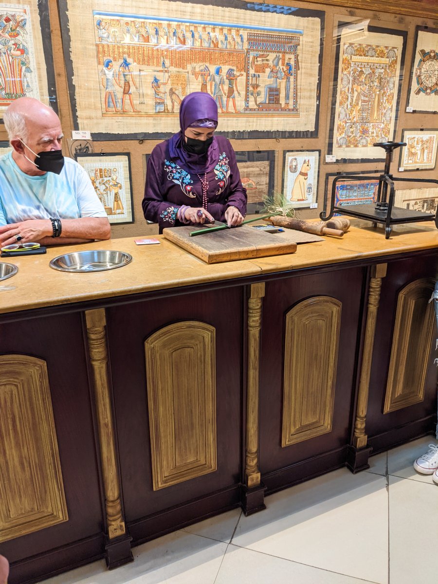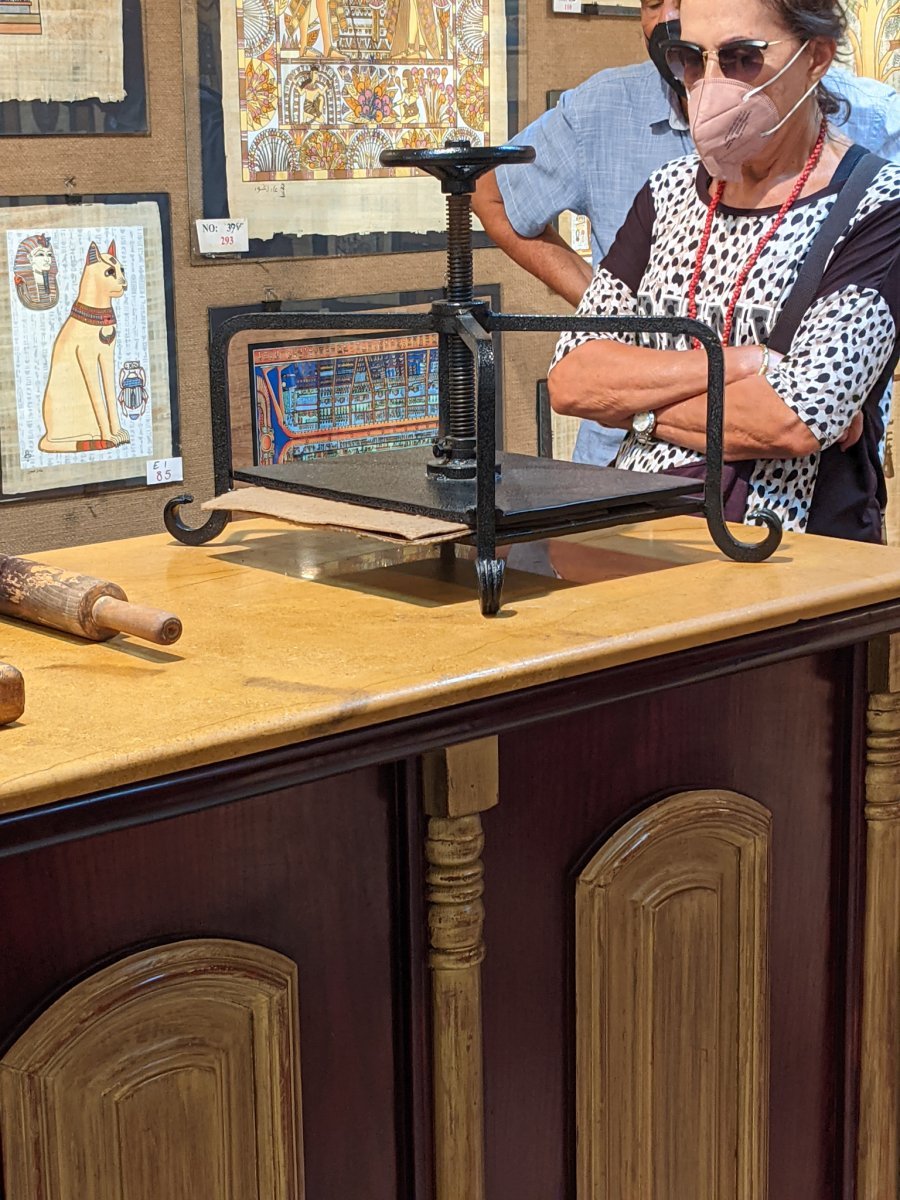 Επόμενη στάση εργαστήρι κατασκευής πάπυρου. Θα βρείτε πολλούς πλανόδιους να πουλάνε έργα με πάπυρο αλλά φυσικά πρόκειται για κατασκευάσματα με ζαχαροκάλαμο. Ο πάπυρος είναι πολύ ακριβώς και πωλείται μόνο σε καταστήματα.