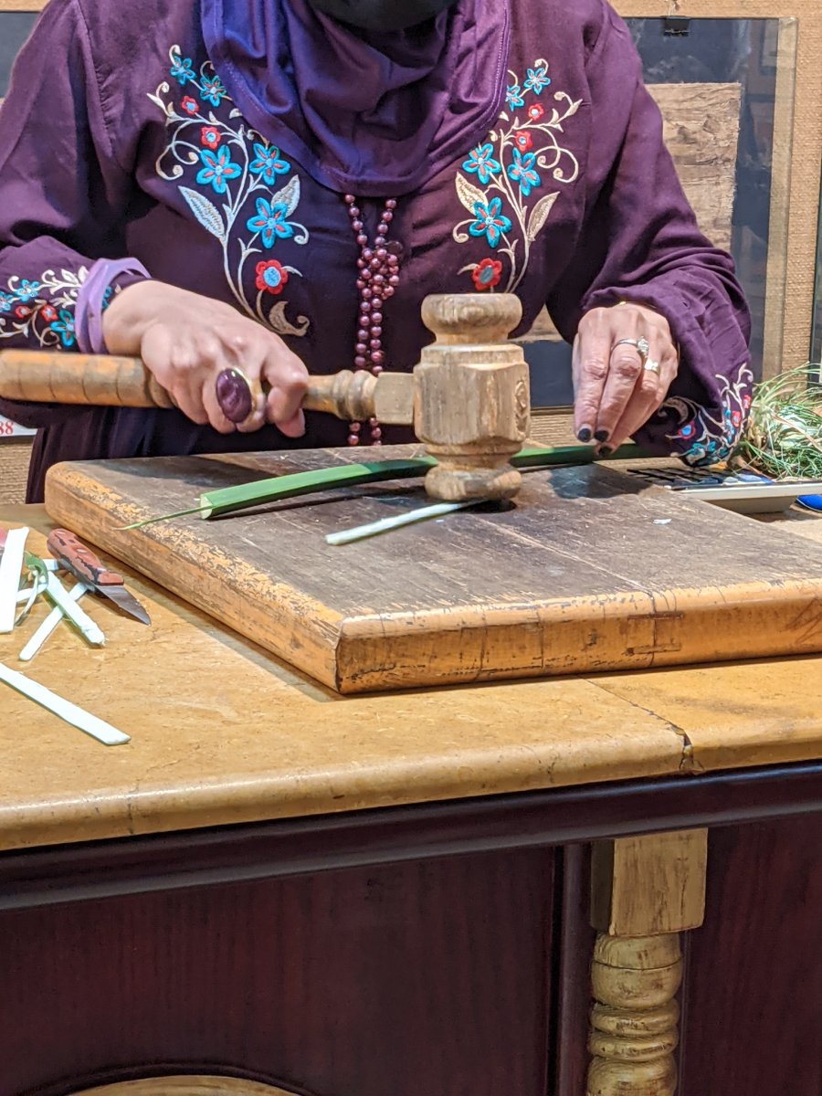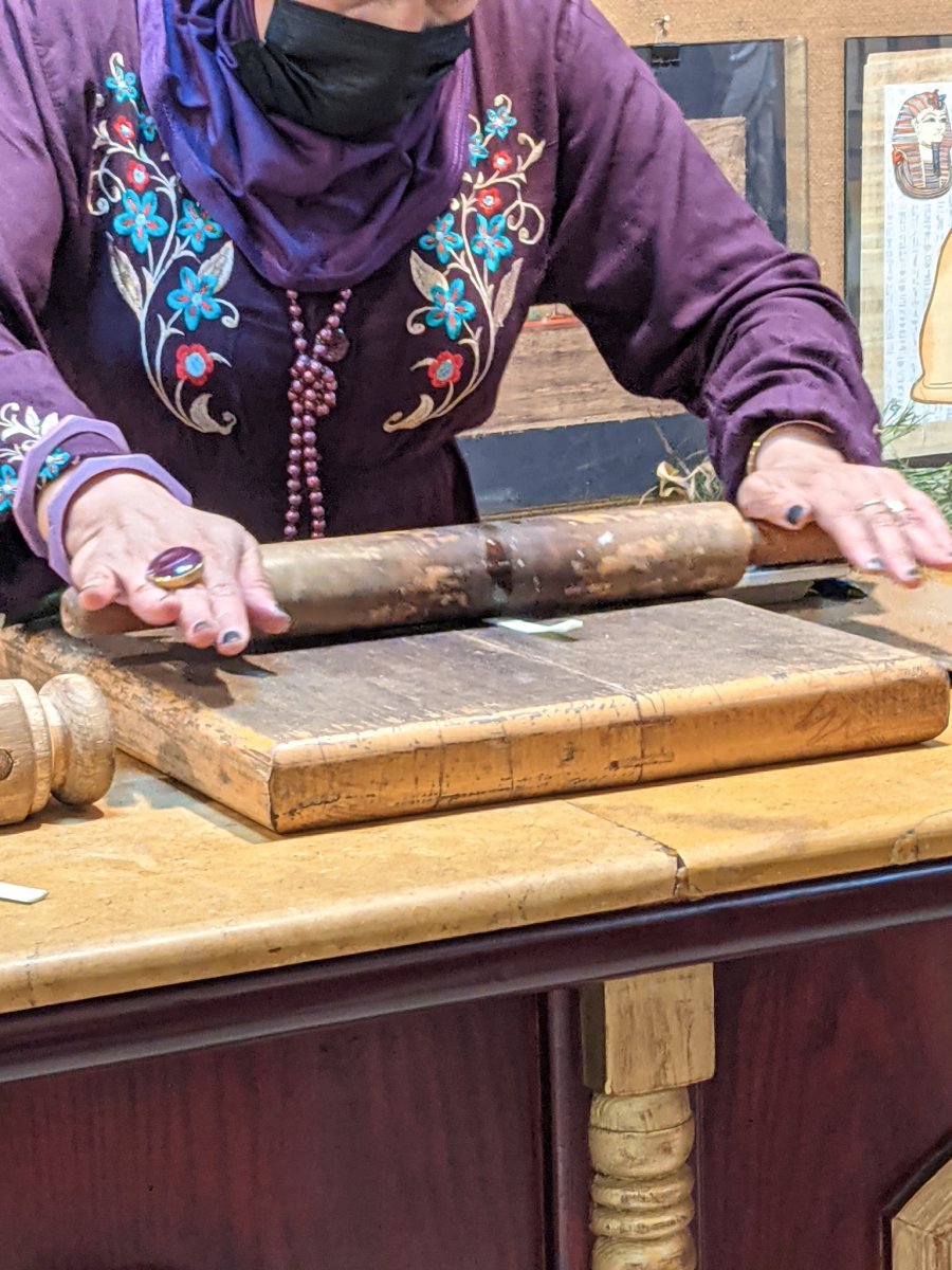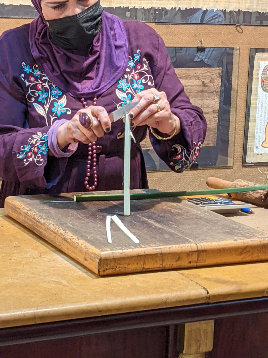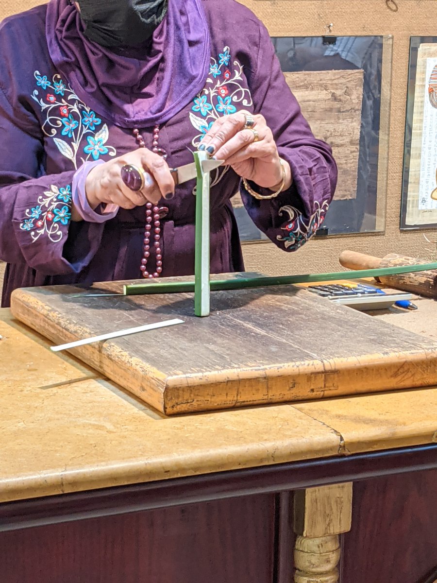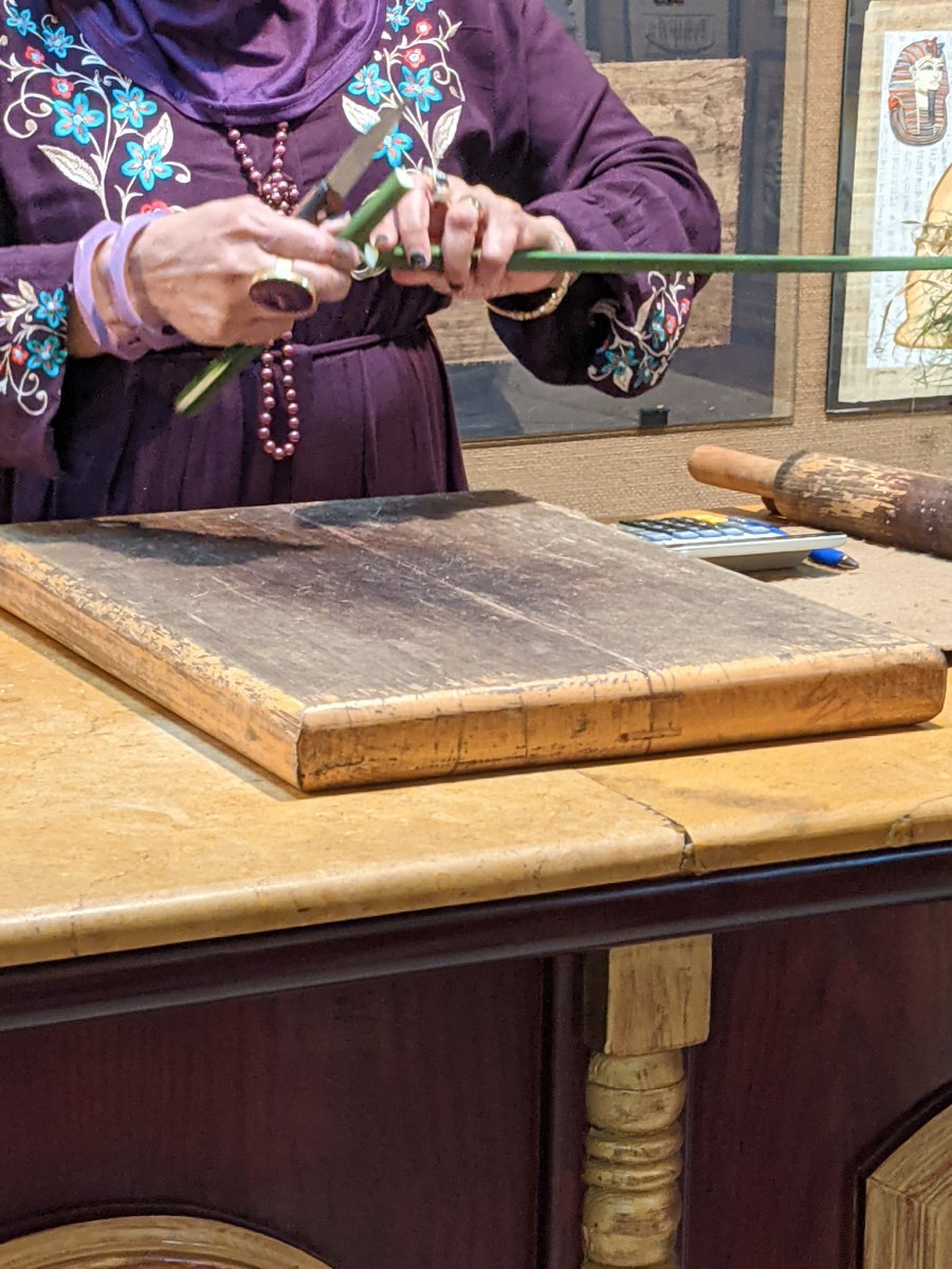 Εκεί μας έδειξαν πως κατασκευάζεται ο πάπυρος από το φυτό. Αφού ξεφλουδίζουν το φυτό, κόβουν σε φέτες την ψίχα τα χτυπάνε με ένα σφυρί και τα περνάνε με ένα πλάστη για να φύγουν όλα τα υγρά που περιέχουν ζάχαρα. Στη συνέχεια τις φλοίδες τις βουτάνε στο νερό και τις αφήνουν για 6 μέρες αν θέλουν να είναι άσπρες ή 12 μέρες αν θέλουν να είναι καφέ. Στη συνέχεια αρχίζουν και τις βάζουν σε ένα κομμάτι δέρμα/ύφασμα σταυρωτά και αφού τις καλύψουν με άλλο ένα κομμάτι δέρμα/ύφασμα, το τοποθετούν σε μία πρέσα για μία βδομάδα και είναι έτοιμος πάπυρος.