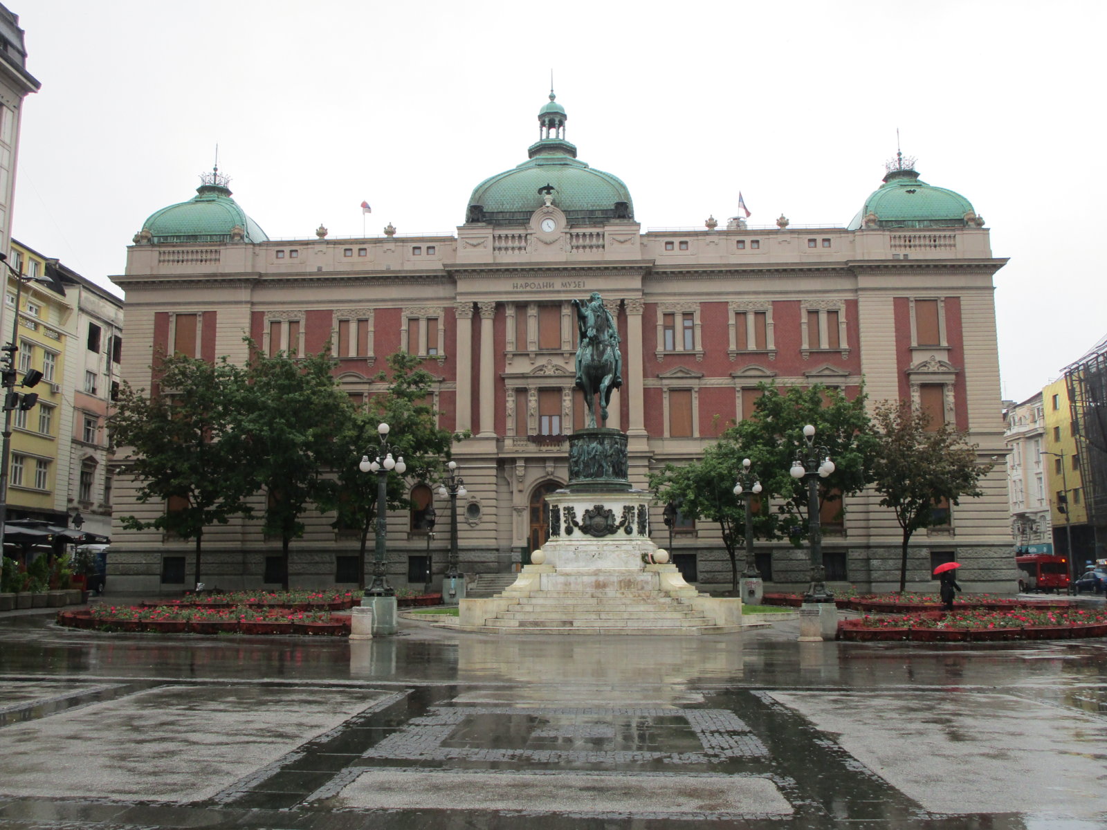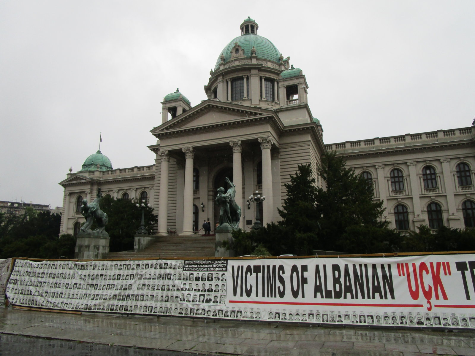 Πλέον βρέχει κανονικά. Ειναι προβληματικο ακόμα και να βγάλεις φωτογραφίες, καθώς γεμιζει με νερα ο φακός. Το 1ο πράγμα που είδαμε ήταν το κοινοβούλιο να είναι "περικυκλωμένο" από κάποια πανώ διαμαρτυρίας/μνήμης για τα θύματα του Κοσσυφοπεδίου: