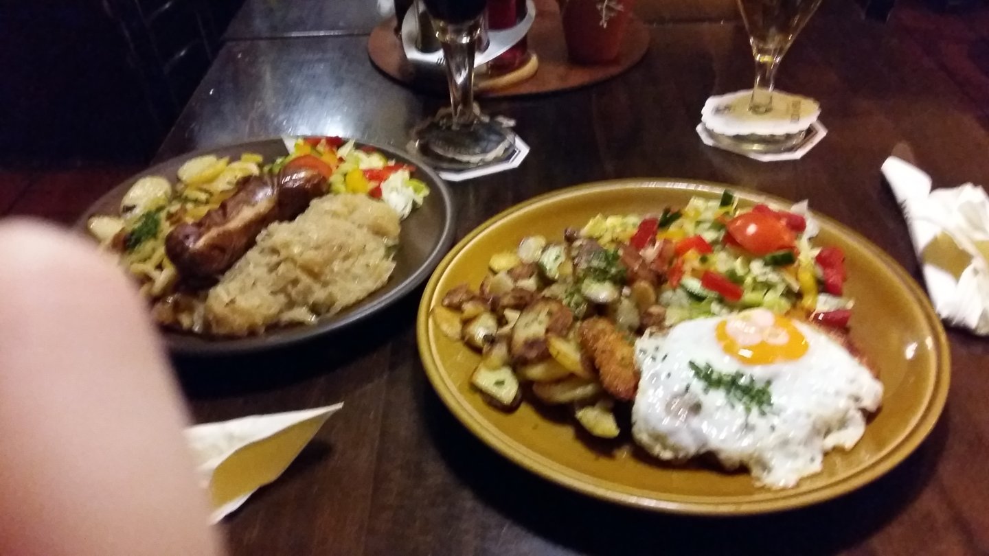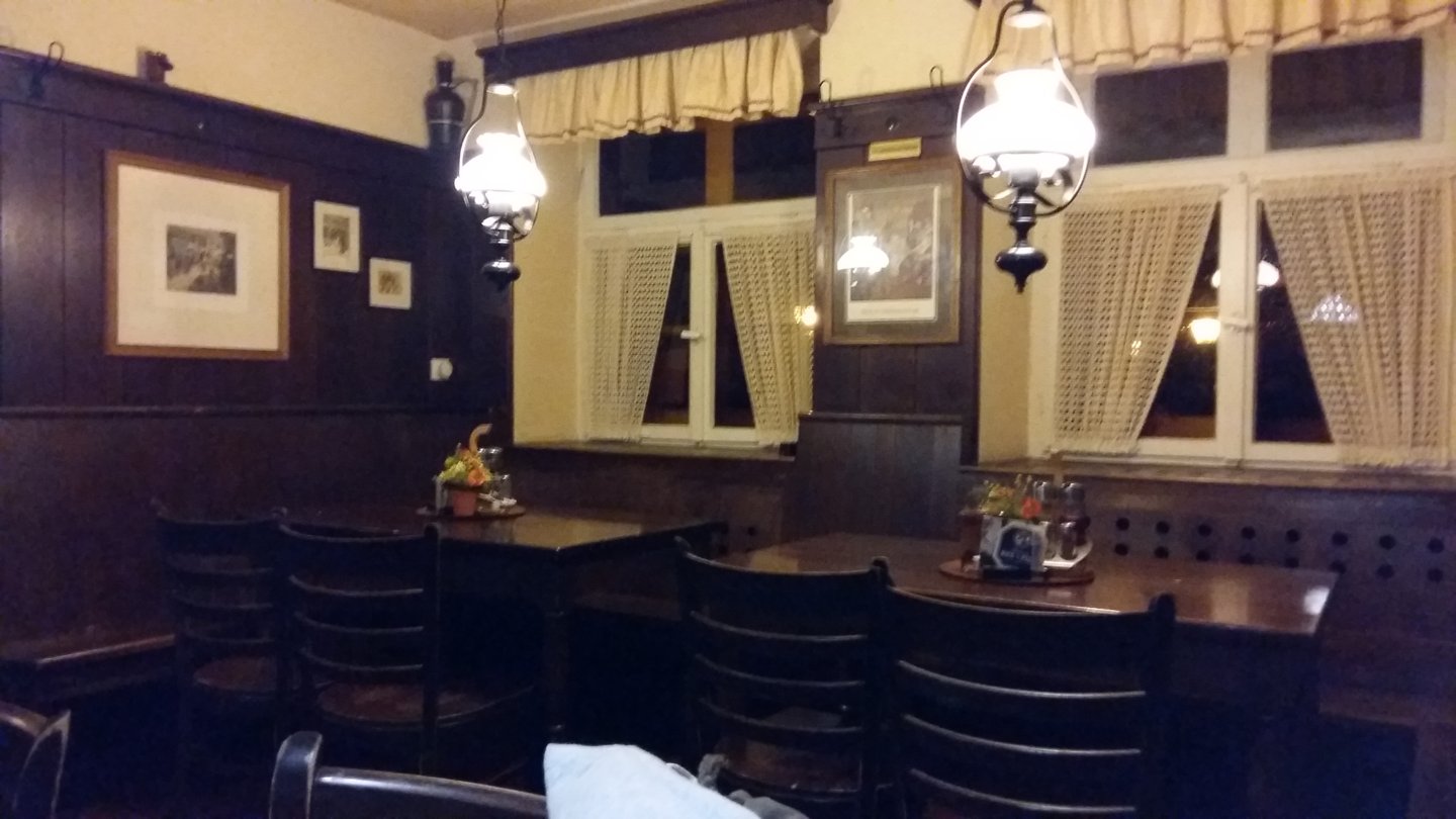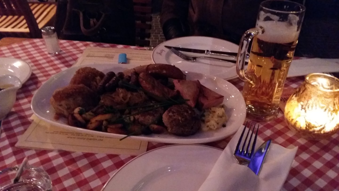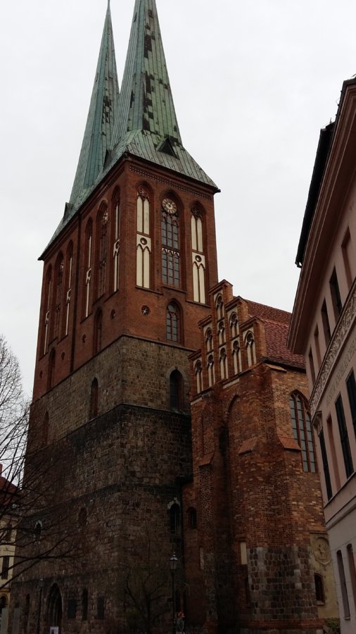 Ήμασταν ενθουσιασμένοι και ανυπόμονοι να γνωρίσουμε το Βερολίνο. Βέβαια υπήρχε και η αναμενόμενη κούραση. Αφού ταχτοποιηθήκαμε και ήπιαμε τις Berliner μας για να χαλαρώσουμε, ξεκινήσαμε να κάνουμε την πρώτη βόλτα μας. Η ώρα είχε πάει αισίως 9 και είχε νυχτώσει. Πεινούσαμε πολύ ήδη και έτσι αποφασίσαμε να κατευθυνθούμε προς την Nikolaiviertel για μια σύντομη βόλτα και αναζήτηση τοπικής αυθεντικής Βερολινέζικης κουζίνας. Από τα πρώτα μας βήματα στο Βερολίνο ήμασταν ενθουσιασμένοι, απολαμβάναμε κάθε βήμα αυτής της κρύας ανοιξιάτικης βραδιάς και προσπαθούσαμε πρόωρα να καταλάβουμε την ατμόσφαιρα της πόλης. Σε λίγα λεπτά, φτάσαμε στην Nikolaiviertel, μια όμορφη γειτονιά, πολύ γραφική, ήσυχη και γεμάτη μεσαιωνικά πλακόστρωτα στενάκια. Εκεί δεσπόζει και ο ναός του Αγίου Νικολάου, δείγμα της ρωμανικής βασιλικής αρχιτεκτονικής, κτισμένος το 1230. Μετά από μια αναγνωριστική περιπλάνηση στα στενά της Nikolaiviertel, κατευθυνθήκαμε προς στο Zum Nussbaum, πρόκειται για εστιατόριο, το οποίο είχαμε εντοπίσει από την Αθήνα. Στην ουσία, πρόκειται για μια παραδοσιακή μπιραρία, με ζεστό χώρο και αρκετά τοπικά πιάτα. Οι πελάτες ήταν όλοι γερμανοί, και το προσωπικό δεν μιλούσε καν Αγγλικά. Ήμασταν τυχεροί γιατί είχαμε βρει αυτό που θέλαμε, μια κλασική αυθεντική Βερολινέζικη μπυραρία με τοπικό φαγητό και πολύ ωραία ατμόσφαιρα.
