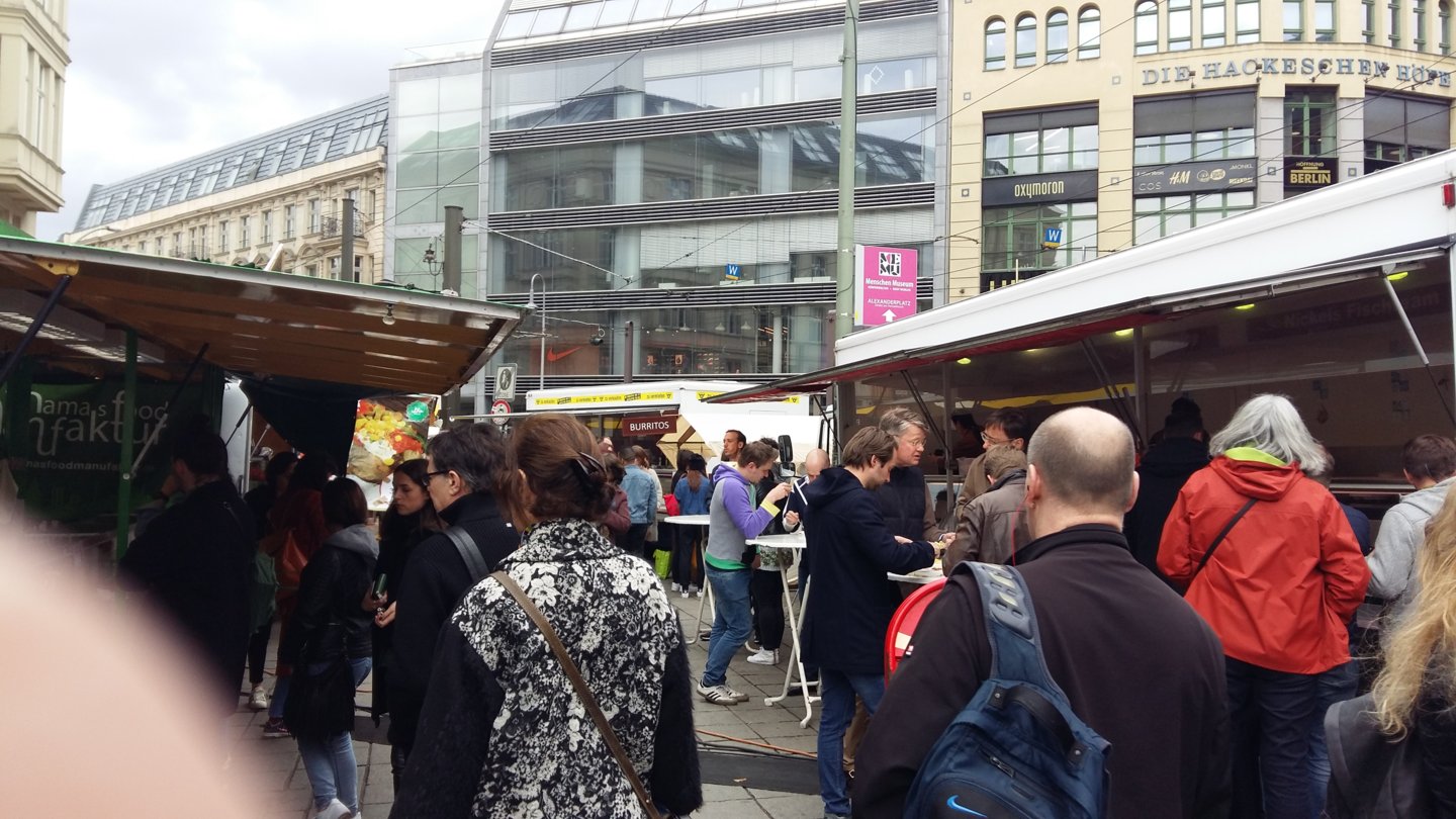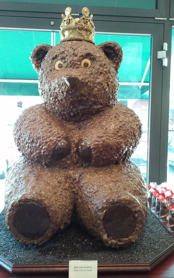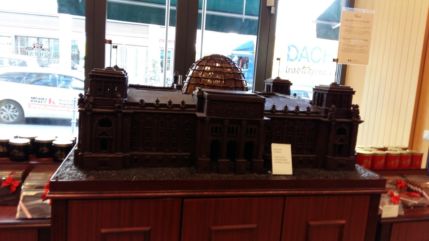 Κοντά στην πλατεία είχαμε πληροφορηθεί ότι υπάρχει το Fassbender & Rausch, μια σοκολατοποιΐα, η καλύτερη κατά πολλούς στο Βερολίνο. Όπως καταλαβαίνετε την επισκεφτήκαμε. Πρόκειται για ένα προσεγμένο χώρο με μια δόση πολυτελείας. Κάθε λογής σοκολάτες και σοκολατάκια υπάρχουν στις προθήκες του, καθώς και πολλά ομοιώματα από σοκολάτα με θέμα τα αξιοθέατα του Βερολίνου και όχι μόνο. Πράγματι, οι σοκολάτες που δοκιμάσαμε ήταν εκπληκτικές, βεβαία η σοκολάτα με αλάτι έκλεψε τις εντυπώσεις. Όσο αφορά τις τιμές έχω να πω πως είναι τσιμπημένες, αλλά όχι απλησίαστες για μια μικρή δόκιμη. Οι σοκολάτες μας άνοιξαν την όρεξη, και μας τράβηξαν την προσοχή οι μυρωδιές από ένα φούρνος που υπήρχε εκεί κοντά. Δυστυχώς όνομα δεν θυμάμαι, άλλα ήταν σχετικά κοντά στο Fassbender & Rausch. Καθίσαμε λοιπόν και φάγαμε πρέτσελ, τάρτες και διάφορα άλλα, καθώς η ποικιλία που διέθετε σε έβαζε σε πειρασμό.