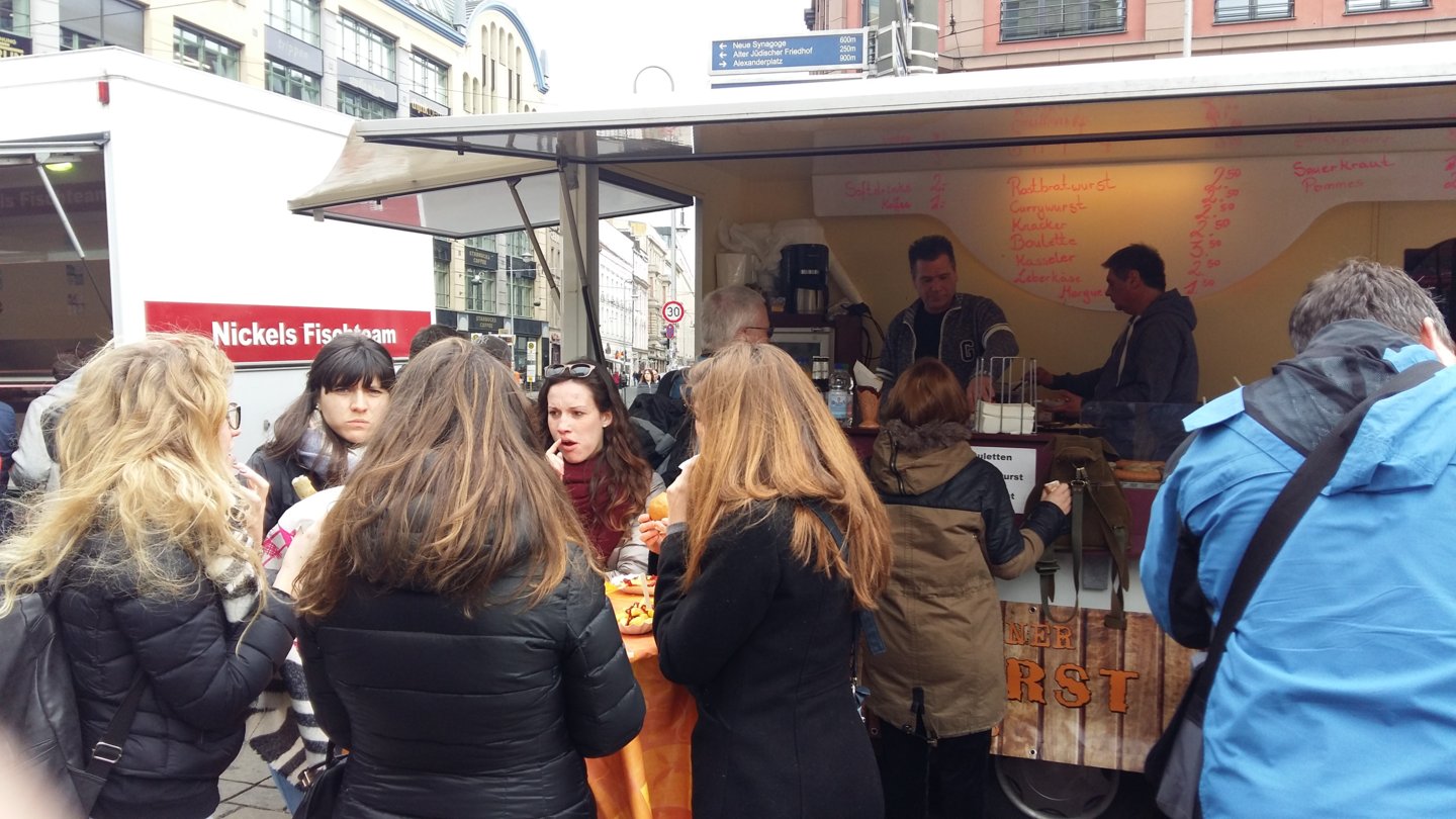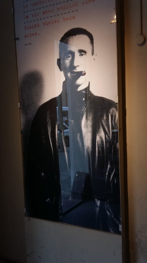 Επόμενος σταθμός το Μουσείο Φυσικής Ιστορίας. Αποφασίσαμε να πάμε με τα πόδια ούτος ώστε να περπατήσουμε μέσα στην πόλη. Και έτσι, ξεκινήσαμε και βρεθήκαμε σε ένα υπαίθριο παζάρι στη Hackescher Markt. Στο τέλος του παζαριού υπήρχε συνωστισμός από καντίνες και πάγκους με street food, curry wurst, ψάρια και χυμούς. Εκεί είχαμε και την πρώτη μας γευστική εμπειρία ενός Curry Wurst, το οποίο ήταν πραγματικά νοστιμότατο. Φαγητό, μυρωδιές, γεύσεις ,χρώματα και κόσμος να τρώει στα όρθια και να πίνει μπύρες, με λίγα λόγια ένα βερολινέζικο μωσαϊκό, ιδανικό για μια σύντομη στάση. Μετά τη στάση μας συνεχίσαμε για το Μουσείο Φυσικής Ιστορίας. Στη διαδρομή περάσαμε από την παλιά εβραϊκή συνοικία, την Εβραϊκή Συναγωγή (από τα ελάχιστα μέρη που υπάρχει εμφανής αστυνομική παρουσία στο Βερολίνο είναι οι συναγωγές), συναντήσαμε το Μουσείο Ramones (δεν μπήκαμε), πολλά μικρά ωραία μαγαζιά και κτίρια. Το να περπατάς στην πόλη έχει πάντα ενδιαφέρον. Αυτό, αποδείχτηκε και στην περίπτωση μας που τυχαία και δίχως να το έχουμε προγραμματίσει βρεθήκαμε μπροστά στο Brecht Haus, το σπίτι αυτής της σπουδαίας φυσιογνωμίας.