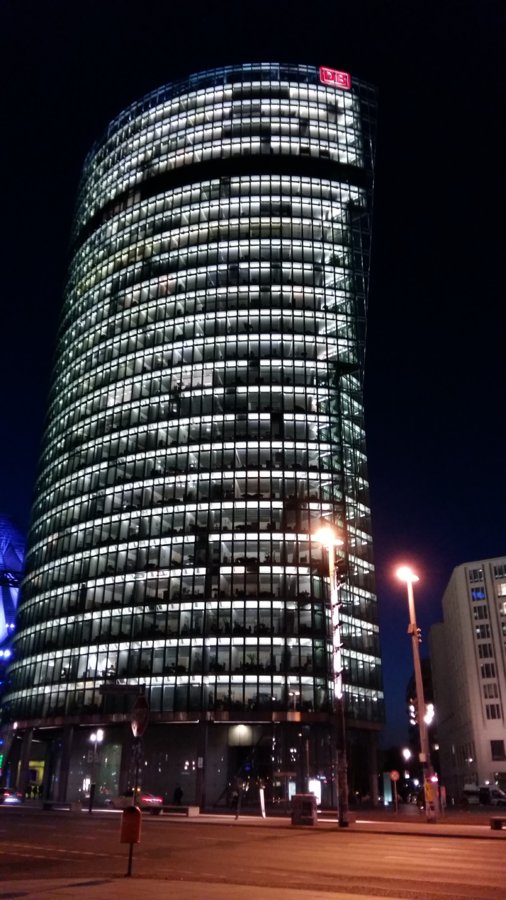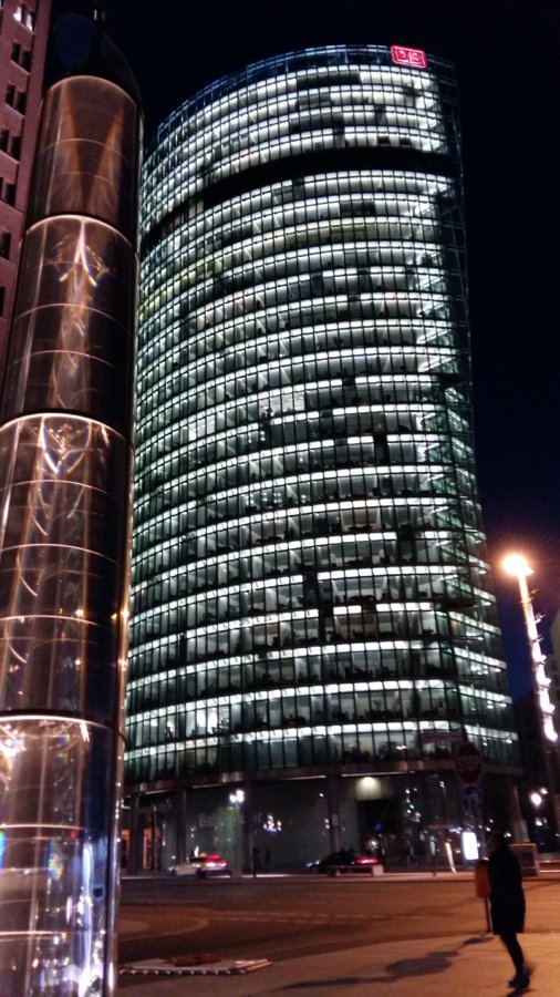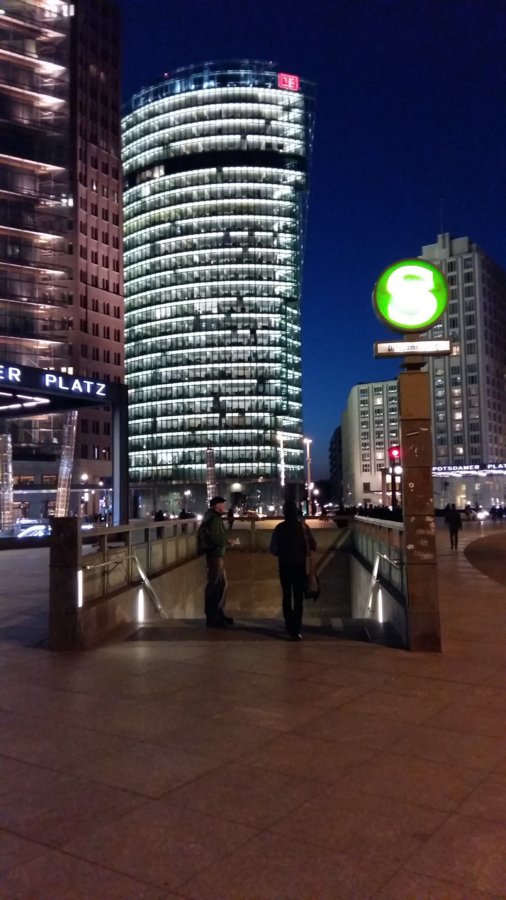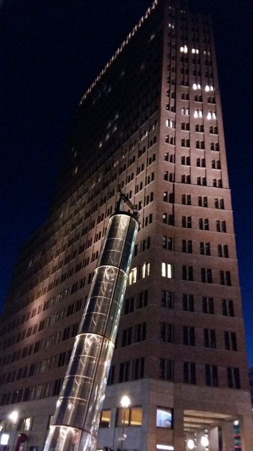 Αφού ξεκουραστήκαμε για λίγο, αποφασίσαμε να επισκεφτούμε την Potsdamer platz. Η Potsdamer platz είχε ισοπεδωθεί κατά τη διάρκεια του πολέμου και τα χρόνια που ακλούθησαν ανοικοδομήθηκε πλήρως. Αυτό έχει σαν αποτέλεσμα πλέον να κυριαρχούν σύγχρονα, εντυπωσιακής αρχιτεκτονικής γυάλινα κτίρια, κάποια από αυτά είναι δημιουργία του Renzo Piano. Επίσης, εκεί βρίσκεται το Sony Center, κινηματογράφοι και αρκετά εστιατόρια. Στην Potsdamer platz φτάσαμε εύκολα με το U-bann. Με το που ανεβαίνεις στην πλατεία αντικρίζεις την συστάδα των εντυπωσιακών κτιρίων και ειδικά την νύχτα με τον εξαιρετικό φωτισμό που διαθέτουν το θέαμα είναι εξαιρετικό. Λίγα μετρά από την πλατεία, διασώζονται και κάποια τμήματα του τείχους. Αντικρίζοντας τα τμήματα αυτά, τα οποία στην ουσία βρίσκονται στην σκιά των συγχρόνων οικοδομικών όγκων, πραγματικά αναλογίζεσαι την αντιφατικότητα που έχει βιώσει και εξακολουθεί να βιώνει αυτή η πόλη και οι κάτοικοι της.