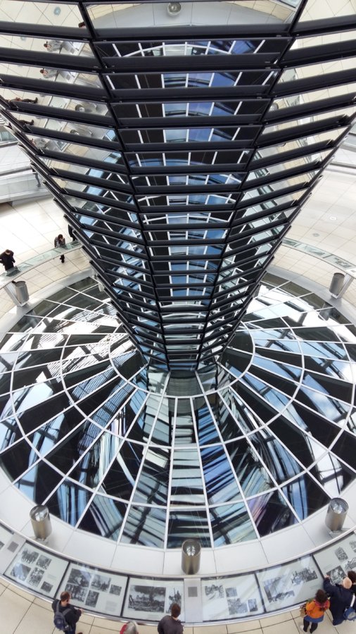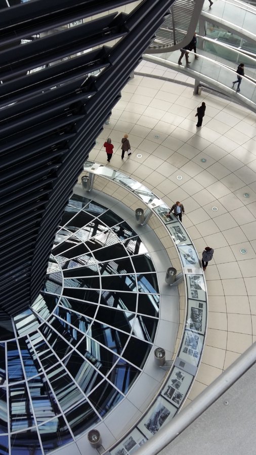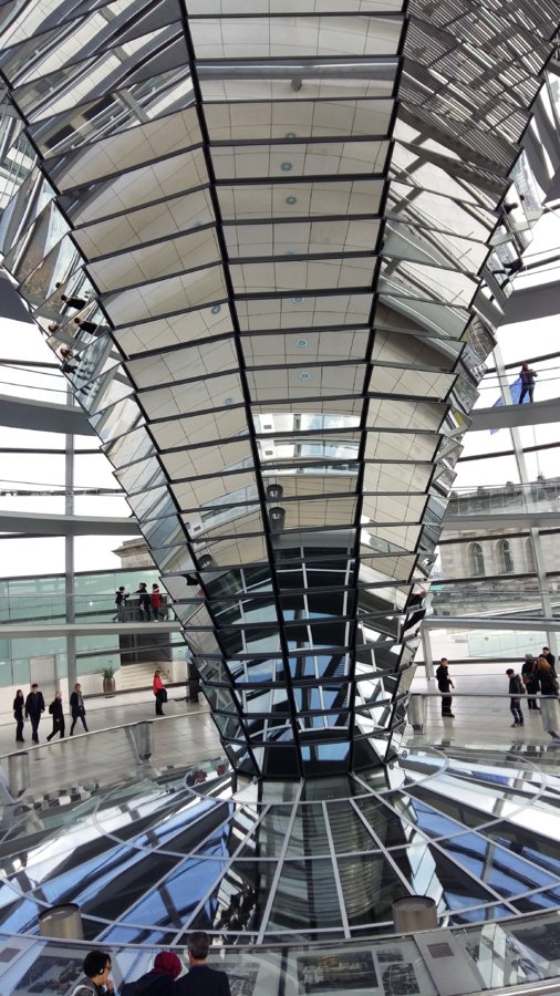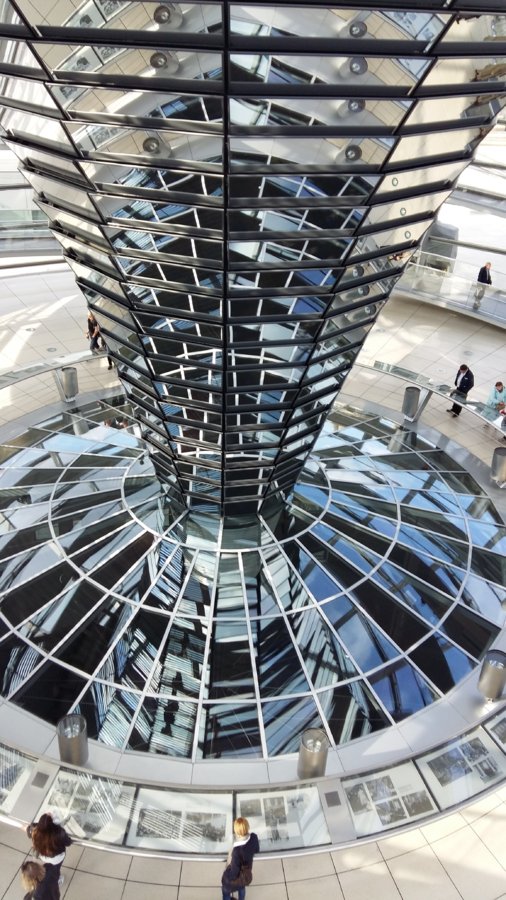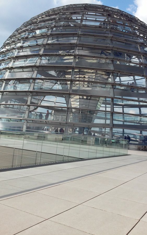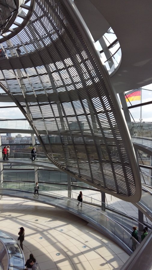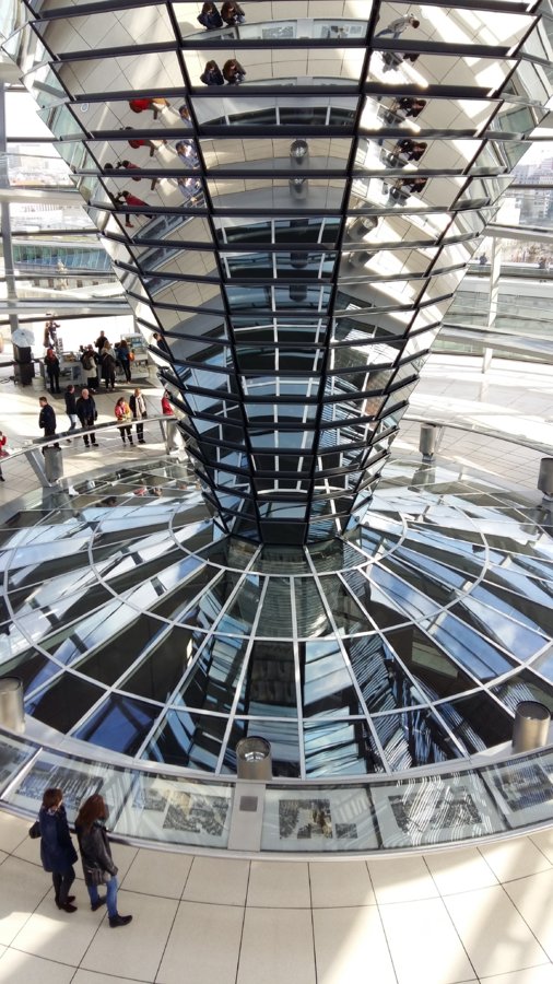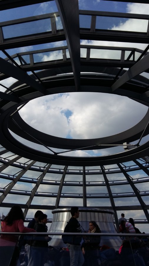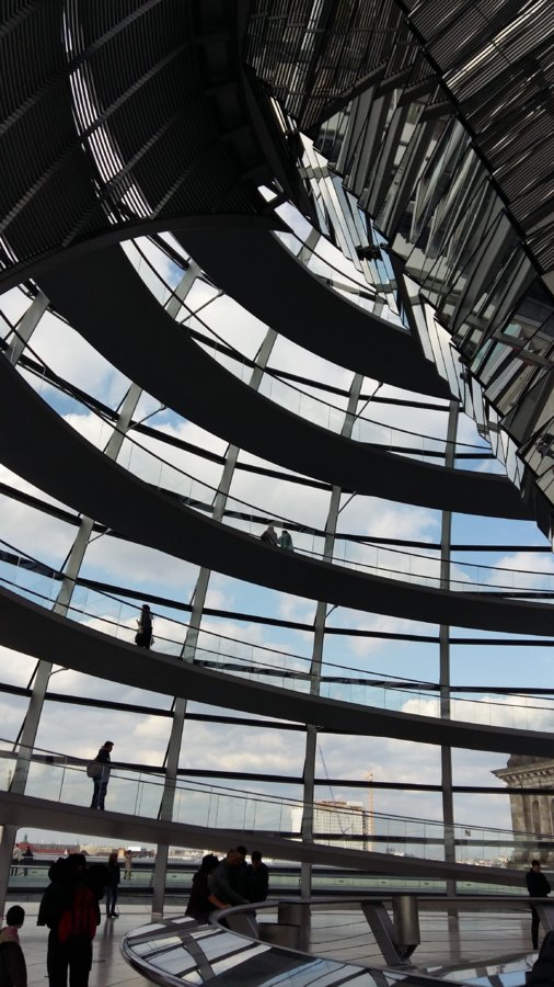 Στην είσοδο του κοινοβούλιο περάσαμε από έλεγχο (πράγμα που συμβαίνει στο σύνολο σχεδόν των μουσείων που πήγαμε) και περιμέναμε για λίγη ώρα. Με ένα γυάλινο ασανσέρ ανεβήκαμε στην οροφή που βρίσκεται ο θόλος. Πράγματι μια εντυπωσιακή δημιουργία από γυαλί, καθρέφτες και μέταλλο με ένα διάδρομο σε μορφή σπιράλ να σε οδηγεί στην κορυφή του θόλου. Η θέα και αυτή αντάξια της φήμης της. Ειδικά, βράδυ το θέαμα πρέπει να απογειώνεται, εμείς δυστυχώς πήγαμε ημέρα. Νομίζω από τις φωτογραφίες μπορείτε να πάρετε μια γεύση. Εκεί μας προμηθεύσαμε με audioguide, το οποίο αναλόγως της θέσης που βρίσκεσαι στον διάδρομο, σου περιγραφεί τη βλέπεις στην γυρω περιοχη.