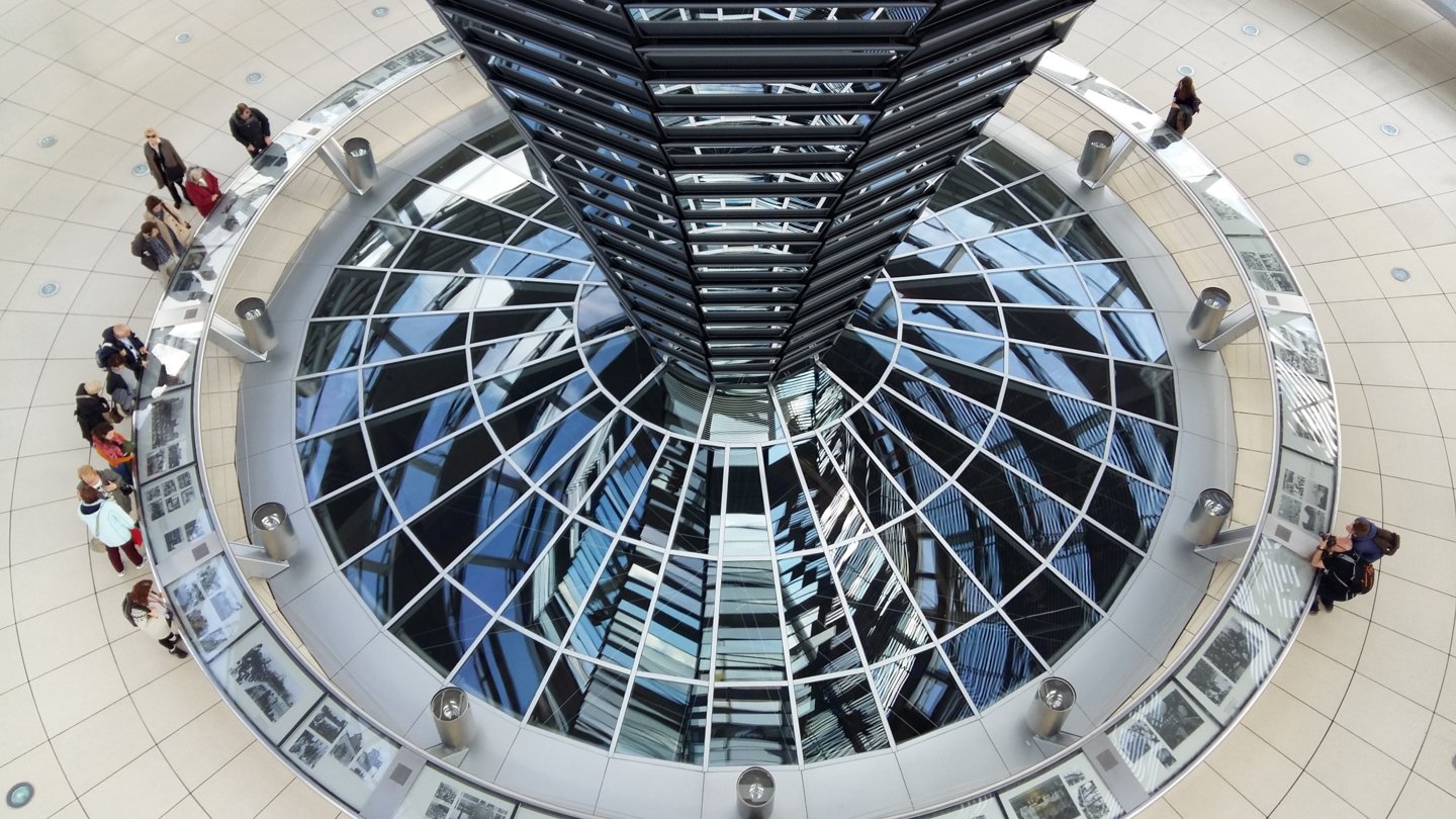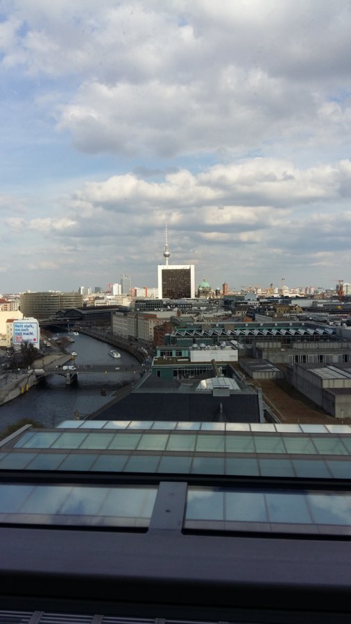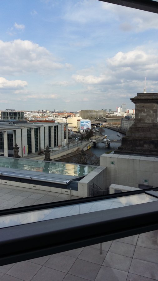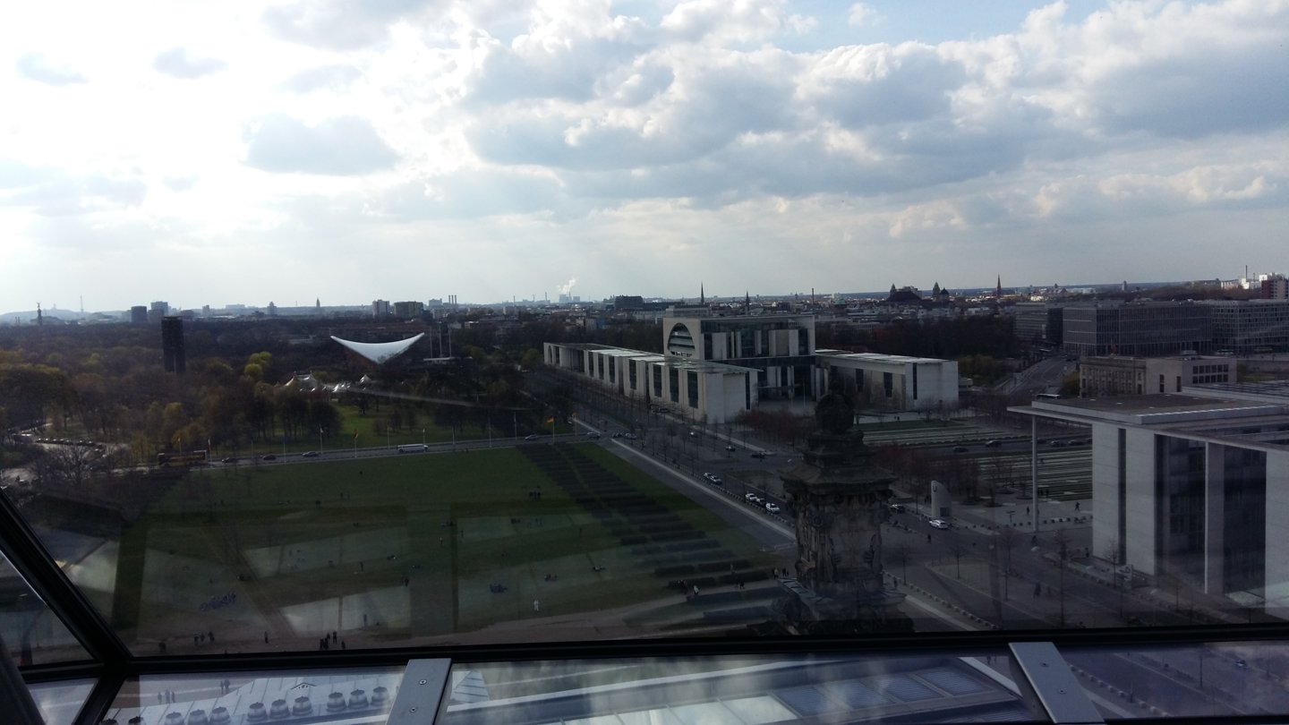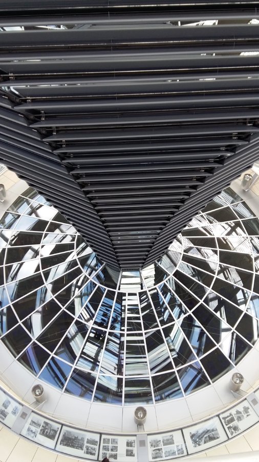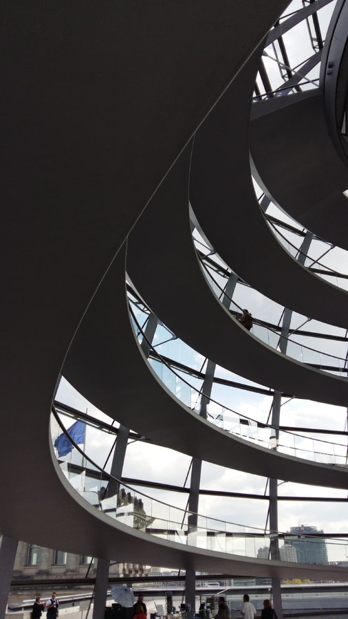 Στην είσοδο του κοινοβούλιο περάσαμε από έλεγχο (πράγμα που συμβαίνει στο σύνολο σχεδόν των μουσείων που πήγαμε) και περιμέναμε για λίγη ώρα. Με ένα γυάλινο ασανσέρ ανεβήκαμε στην οροφή που βρίσκεται ο θόλος. Πράγματι μια εντυπωσιακή δημιουργία από γυαλί, καθρέφτες και μέταλλο με ένα διάδρομο σε μορφή σπιράλ να σε οδηγεί στην κορυφή του θόλου. Η θέα και αυτή αντάξια της φήμης της. Ειδικά, βράδυ το θέαμα πρέπει να απογειώνεται, εμείς δυστυχώς πήγαμε ημέρα. Νομίζω από τις φωτογραφίες μπορείτε να πάρετε μια γεύση. Εκεί μας προμηθεύσαμε με audioguide, το οποίο αναλόγως της θέσης που βρίσκεσαι στον διάδρομο, σου περιγραφεί τη βλέπεις στην γυρω περιοχη.