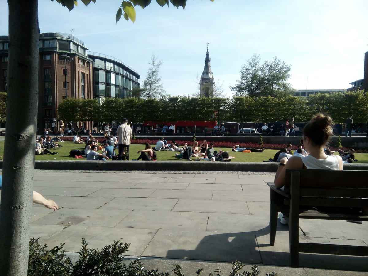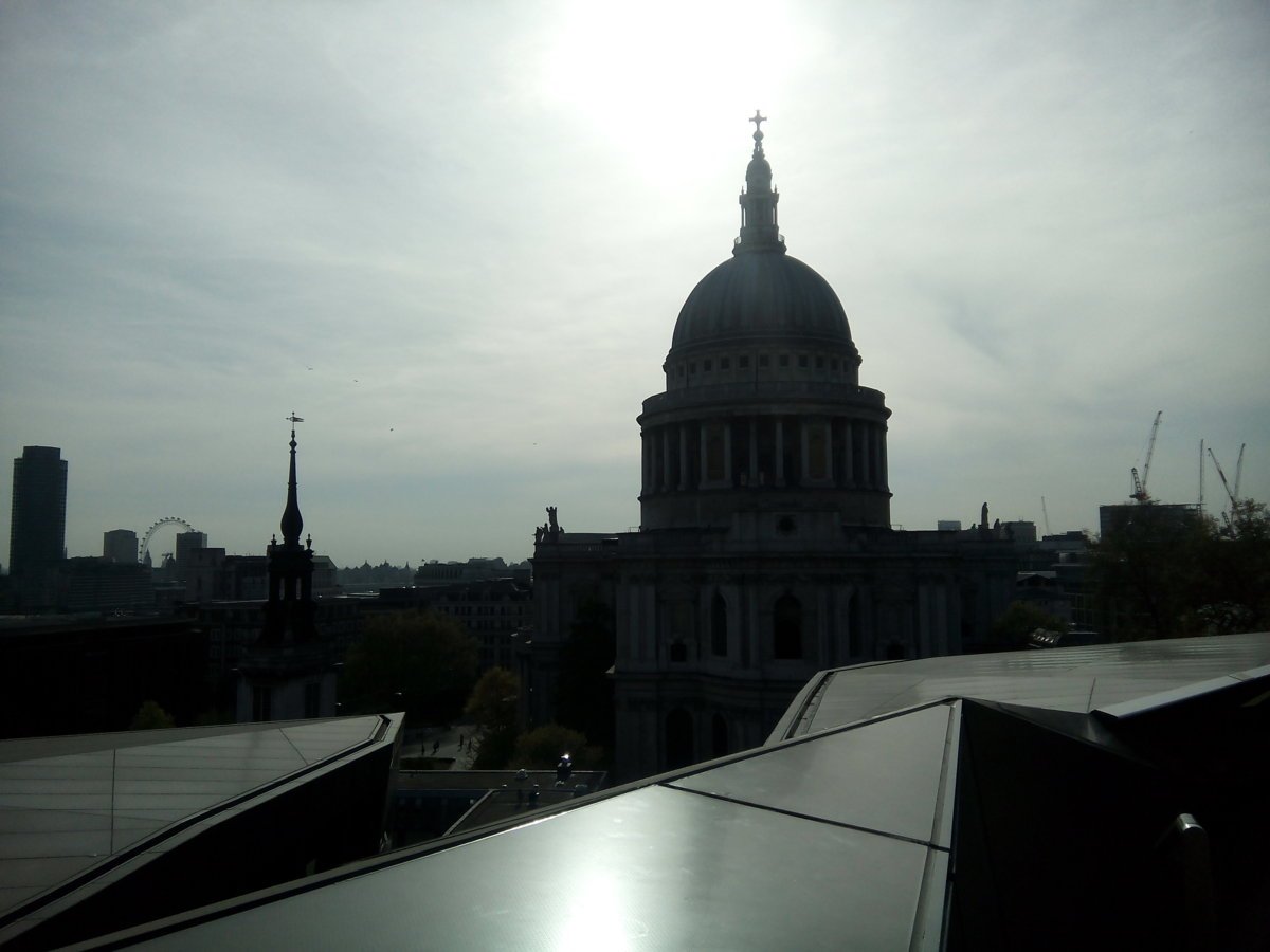 Αποφασίσαμε να απολαύσουμε την θέα του ναού από την ταράτσα του απέναντι εμπορικού κέντρου one new change.Ήταν Παρασκευή νωρίς το απόγευμα και είχε μια τεράστια ουρά καλοντυμένων που περίμεναν να ανέβουν για να πιούν το ποτό τους .Αν όμως έλεγες πως ήθελες να πας μόνο στην ταράτσα να δεις την θέα δεν περίμενες ουρά. Να το θυμάστε αυτό αν θελήσετε να πάτε κι εσείς. Εμείς χαζεύαμε την δωρεάν θέα αλλά και τους στριμωγμένους Λονδρέζους που μετά την δουλειά έπιναν όρθιοι το ποτό τους. Οι δε γυναίκες πάνω στα ψηλοτάκουνα! Μα πώς το κάνουν αυτό αμέσως μετά την δουλειά, χαρά στο κουράγιο τους. Κατεβαίνοντας να πάρουμε το λεωφορείο για το ξενοδοχείο βλέπαμε κόσμο να ξαπλώνει στα γρασίδια και να απολαμβάνει τον ήλιο.
