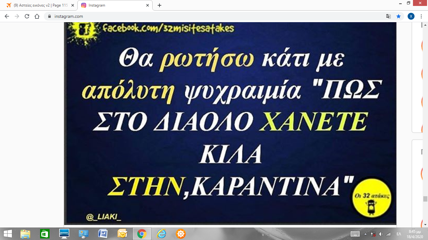 21 Απριλίου 2020 #1.375 mikrh tsopana Member Μηνύματα 1.893 Likes 9.098 Επόμενο Ταξίδι Ελλάδα-Παλέρμο-Μπιλμπάο Ταξίδι-Όνειρο θα το αποφασίσω αύριο chris7 said: View attachment 308891 κλικ για όλη την παράθεση... Πάντα όταν δεν πολυβγαίνω/δε βγαίνω καθόλου εν προκειμένω, χάνω κιλά. Υποθέτω λιγότερες μπύρες και καθόλου μεζέδες. Απλόν.