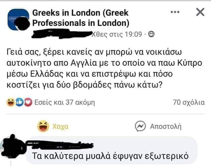 Δεν μπορώ να καταλάβω το αστείο εδώ πέρα. Το ότι υπάρχει θάλασσα στο ενδιάμεσο; Γιατί έχει μπει καράβι πλέον για κάποιους μήνες από Πειραιά για Λεμεσό που μπορείς να ανεβάσεις και το αυτοκίνητο. Από Αγγλία για Γαλλία δεν ξέρω τι παίζει