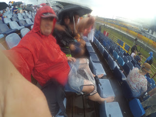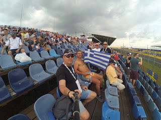 Το ιδιο σκηνικο και την δευτερη μερα το Σάββατο 23/7/2016 απο αλλη τοποθεσία, στην αρχη ευθείας τερματισμου με συννεφια αρχικα και μετα με καλη βροχή γίναμε μουσκεμα αλλα δεν κουνηθήκαμε απο την θέση μας....Μαλιστα δεν ειχαμε και ομπρελες μαζι και αναγκαστήκαμε να παμε στο αυτοκινητο 20 λεπτα δρομος και 20 λεπτα να γυρισουμε μεσα στην βροχη ετσι ωστε να παρουμε ομπρελες τιποτα αδιαβροχα και ρουχα στεγνα.....μεσα σε σακούλες....Μην παθουμε και καμια πνευμονία...Θα αλλαζαμε μετα την βροχή οταν σταματούσε...Οποτε καταλαβαίνετε τι γινονταν στις κερκίδες....Ο Κώστας επειδή μετα θα πηγαιναμε στα λουτρα Shegenie....φορουσε μαγιο απο κατω οποτε στην βροχή εβγαλε ολα τα ρουχα του και ηταν με το μαγιο....Περιτο να σας πω τι γινονταν απο πειραγματα απο τους διπλα θεατες.....