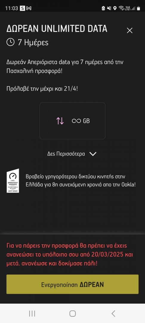 Και απο παραγγελιες στο Box καμποσα αναλογα το ποσο.Στα συμβόλαια μόνον πληρωμή(11,90 για την ακρίβεια).Πρός τα παρόν υπάρχουν τα 3 GB δωρεάν για κάθε λογαριασμο που πληρώνεις μέσω της εφαρμογής.