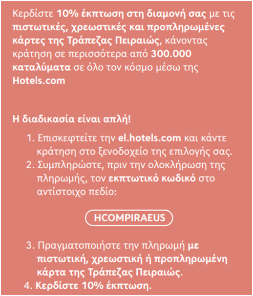 Το μόνο που ισχύει και με έχει βολέψει σε ακριβές διαμονές είναι η 8% επιστροφή της VISA, με τα μειονεκτήματα που έχει (πλέον έχει εξαίρεση σε πολλές αλυσίδες ξενοδοχείων, ενώ εφαρμόζεται μόνο στο ένα δωμάτιο της κράτησης, οπότε αναγκάζεσαι να κάνεις ξεχωριστές κρατήσεις, στις περιπτώσεις που θες να κλείσεις παραπάνω δωμάτια).