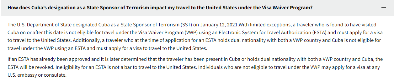 Σωστα, αλλα δεν ακολουθουν ολοι υην οδηγια, οσο απιστευτο κι αν ακουγεται. Μολις την προηγουμενη εβδομαδα σε Βρετανιδα φιλη απορριφθηκε η ESTA επειδη πηγε στην Κουβα το 2017.