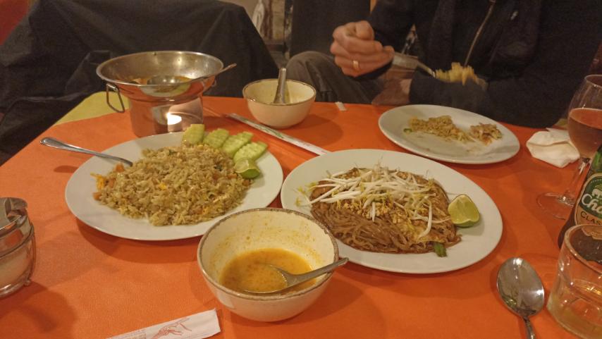 Δυστυχώς όσο κάτσαμε ήμασταν οι μοναδικοί πελάτες και το φαγητό είχε αρκετές αδυναμίες. Μας εξυπηρέτησαν πολύ εγκάρδια και πληρώσαμε λίγο λιγότερο από 20€ το άτομο για ό,τι βλέπετε, συν ένα ορεκτικό, μισό κιλό κρασί και 1 chang.