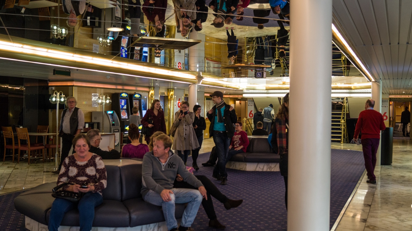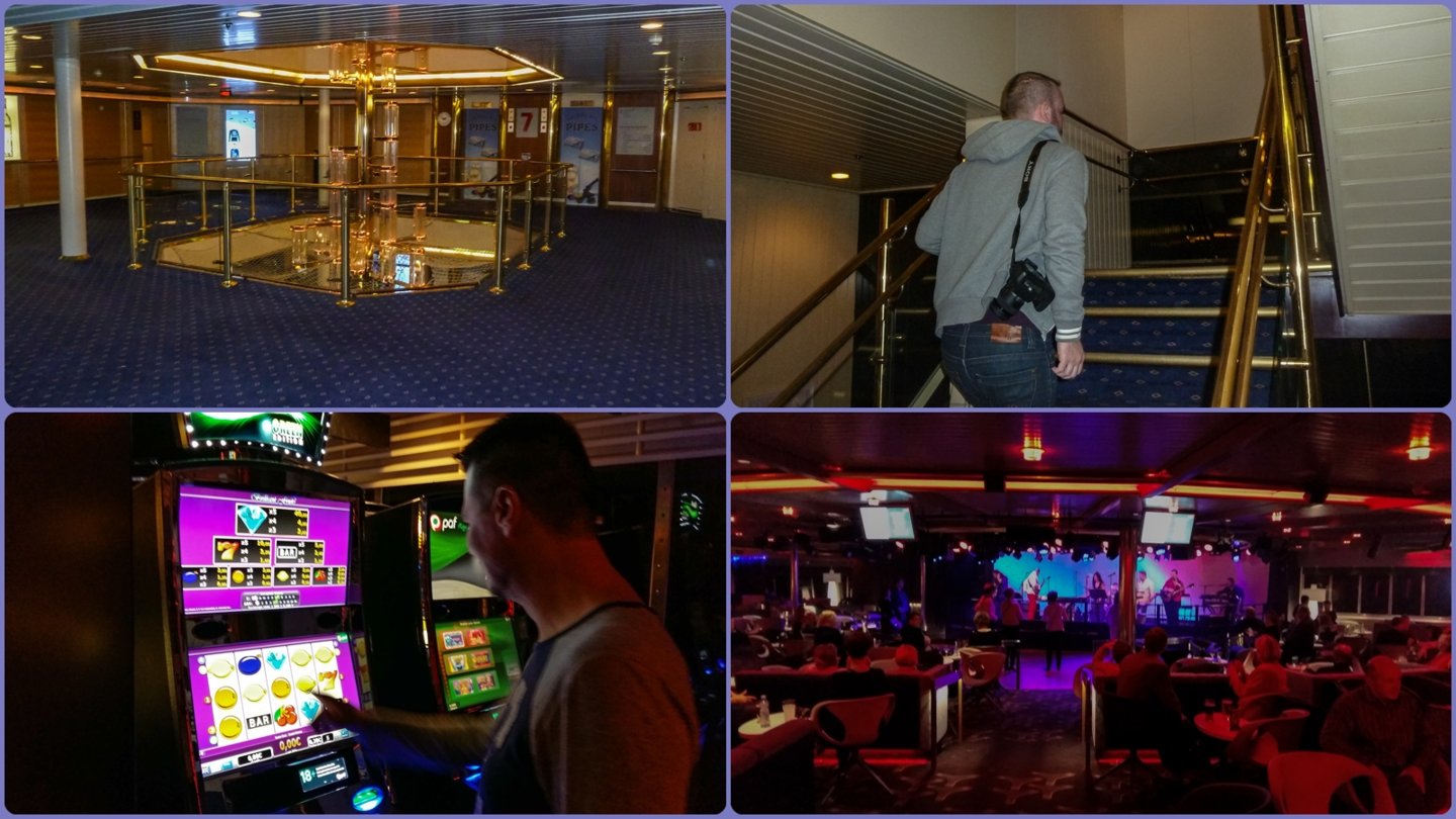 Ήταν 9 το βράδυ και είπαμε να κάνουμε την εμφάνιση μας στα σαλόνια και στους δημόσιους χώρους του πλοίου. Στον 6ο και 7ο όροφο είναι οι χώροι διασκέδασης και χαλάρωσης του επιβατικού κοινού. Ένα κατάστημα με αφορολόγητα, 2-3 μπαρ με ζωντανή μουσική, ένα εστιατόριο με μπουφέ και 3 εστιατόρια αλά καρτ πολύ γκλαμουράτα αλλά και κουλοχέρηδες και άλλα τυχερά παιχνίδια.