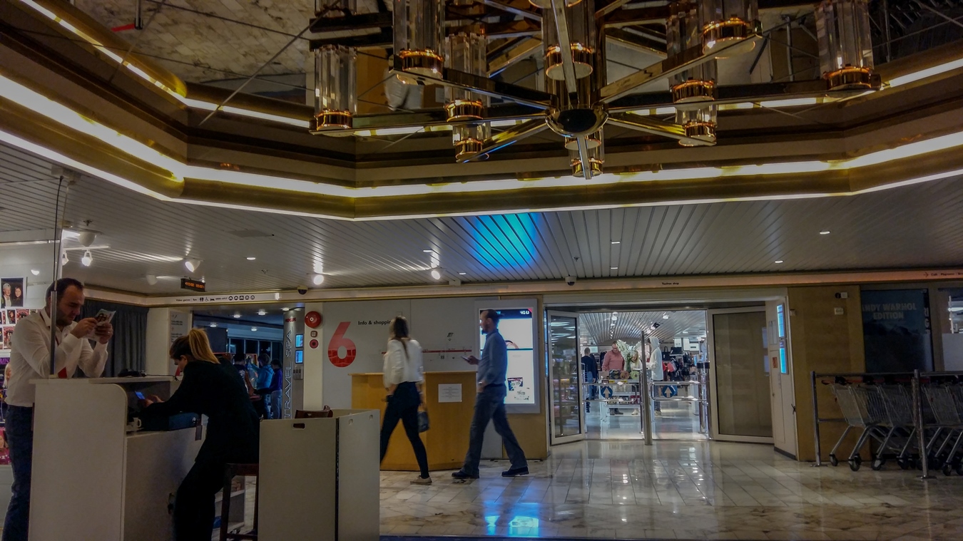 Είχε κόσμο και η ατμόσφαιρα έμοιαζε γιορτινή. Αράξαμε και στα καναπεδάκια στο σαλόνι και στο διάδρομο που είναι όλα τα μαγαζιά και ακούσαμε και το μουσικό πρόγραμμα από το ανοιχτό μπαρ που δεν ήταν καθόλου άσχημο. Κάναμε βόλτα παντού και στα αφορολόγητα και γενικά τριγυρίσαμε σε όλους τους χώρους και βέβαια ήρθε η ώρα που πεινάσαμε. Είχαμε φάει σχεδόν όλα τα σνακ που είχαμε στην καμπίνα, υποτίθεται για να αποφύγουμε να ακριβοπληρώσουμε οτιδήποτε μέσα στο πλοίο αλλά τελικά δεν γινόταν. Μπορεί να μην επιλέξαμε τα σπέσιαλ εστιατόρια αλλά ευτυχώς το πλοίο είχε και ένα κυλικείο. Έτσι καταβροχθίσαμε από ένα σάντουιτς πατημένο σε τοστιέρα που είχε 6 ευρώ το ένα. Δεν είχε και μεγάλη ποικιλία από σνακ. Μόνο σάντουιτς, σαλάτες και κάτι γλυκά που δεν μου γέμισαν το μάτι.