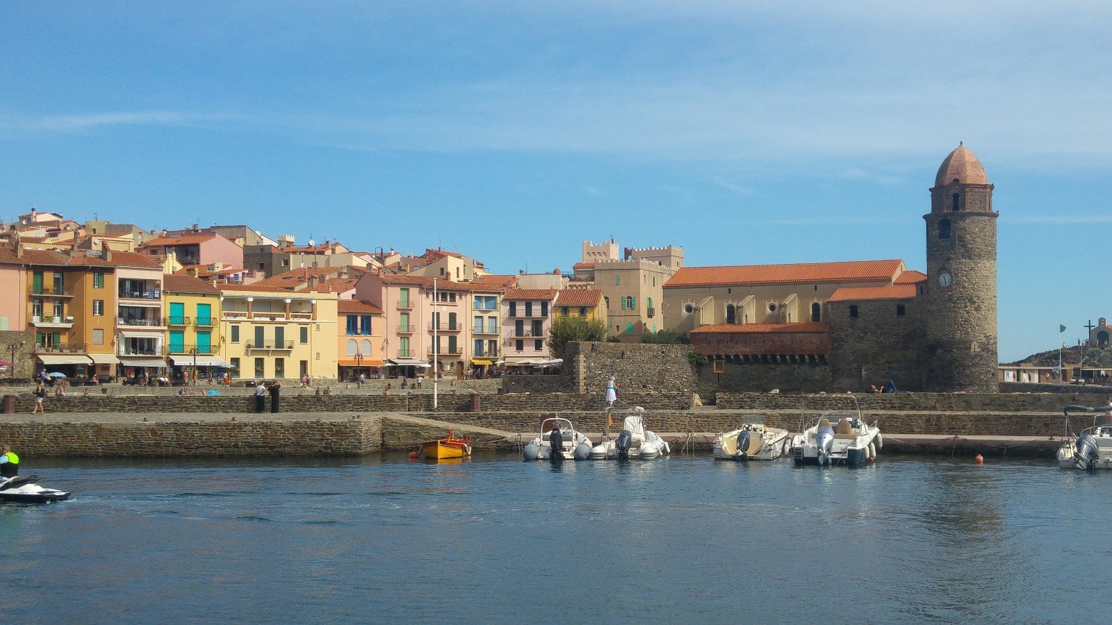 Το ομορφότερο χωριό της περιοχής είναι η Κολιούρ (Collioure). Όπως διαβάζω στον οδηγό, από τις αρχές του 20ου αιώνα το μεσογειακό φως, τα χρωματιστά βαρκάκια και τα γραφικά σπιτάκια ενέπνευσαν τον Ματίς και άλλους ζωγράφους και το έκαναν στέκι τους. Στέκι καλλιτεχνών παραμένει μέχρι σήμερα. Στο πανέμορφο λιμανάκι δεσπόζει το βασιλικό κάστρο που έχτισαν οι Ναίτες ιππότες και ο παλιός φάρος που έχει μετατραπεί στην εκκλησία Παναγία των Αγγέλων (Notre-Dame-des-Anges, δείτε στην πρώτη φωτο). Ναι, καλά καταλάβατε, εδώ θα απολαύσω τον πρώτο καφέ της ημέρας!
