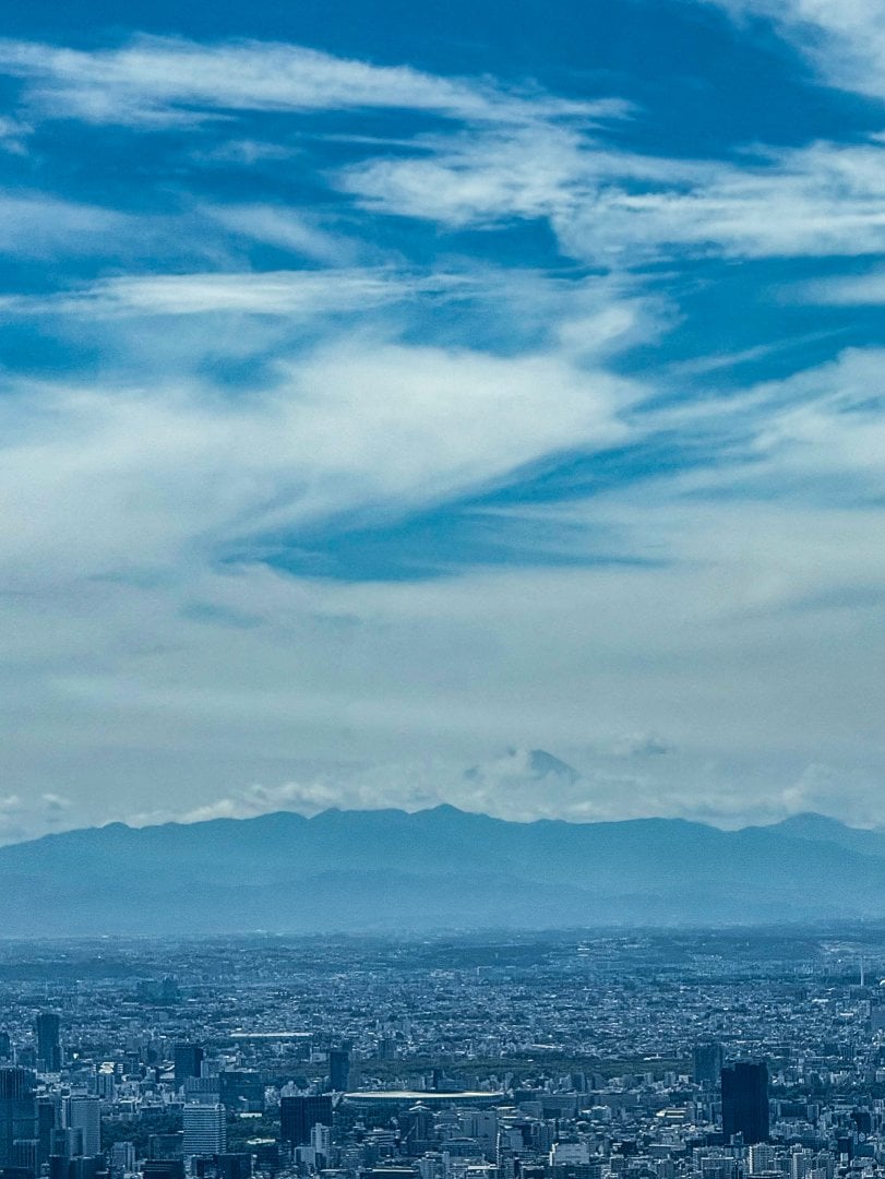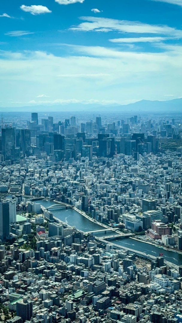 Στη συνέχεια κατευθυνθήκαμε με τα πόδια στη γειτονική περιοχή Sumida και στον Πύργο Tokyo Skytree για πανοραμική θέα της πόλης. Από το 2023 είναι ο πιο ψηλός ουρανοξύστης της Ιαπωνίας (πιο πριν ήταν ο Haruka που είδαμε στην Οσάκα) και ο 2ος ψηλότερος του κόσμου (μετά το Burj Khalifa). Έχει 2 παρατηρητήρια, το ένα στα 350μ και το άλλο στα 450μ. Το να κοιτάς αυτή την χαοτική μητρόπολη των 33.000.000 κατοίκων από τόσο ψηλά σου κόβει την ανάσα, πραγματικά ένιωθα λες και ήμουν σε αεροπλάνο. Οι άλλοι ουρανοξύστες φαινόντουσαν σαν απλές πολυκατοικίες. Έβλεπες τα skylines σε διάφορα σημεία της πόλης, τους ποταμούς, τα πάρκα, παρατηρούσες το ανάγλυφο της πόλης αλλά και το πόσο “απλωμένη” είναι σε έκταση. Η μεγάλη έκπληξη και απερίγραπτη συγκίνηση ήταν όταν για ελάχιστα δευτερόλεπτα έκανε την εμφάνισή της μέσα από τα σύννεφα η κορυφή του Φούτζι και μέχρι να καταλάβω τι είχε συμβεί, ξανατυλίχτηκε στην ομίχλη... ίσα που πρόλαβα να βγάλω μια φωτογραφία λίγο πριν εξαφανιστεί και πάλι: