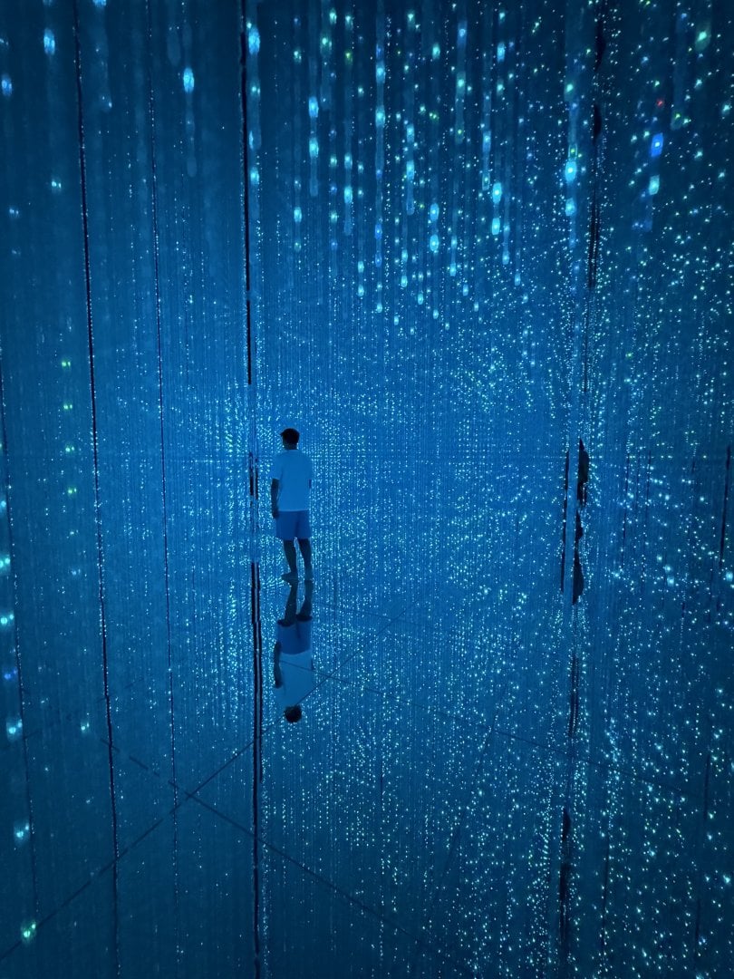 Φτάσαμε επιτέλους κάποια στιγμή στον προορισμό μας. Το TeamLab Planets είναι ένα ψηφιακό μουσείο που συνδυάζει την τέχνη με την τεχνολογία. Αυτό που το κάνει ξεχωριστό είναι ότι δεν βλέπεις απλώς την τέχνη αλλά την ζεις! Είναι διαδραστικό και συμμετέχεις με όλες τις αισθήσεις σου... Βγάζεις παπούτσια, περπατάς ξυπόλητος, μπαίνεις σε νερά. Γι΄ αυτό καλό είναι να φοράς σορτς ή μακρυά φούστα γιατί αν φοράς παντελόνι θα βραχεί. ΠΡΟΣΟΧΗ: ΟΧΙ μίνι φούστα γιατί τα περισσότερα πατώματα έχουν καθρέφτες!!