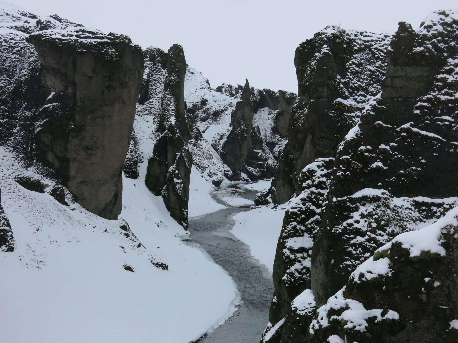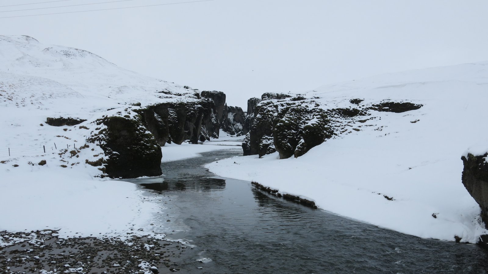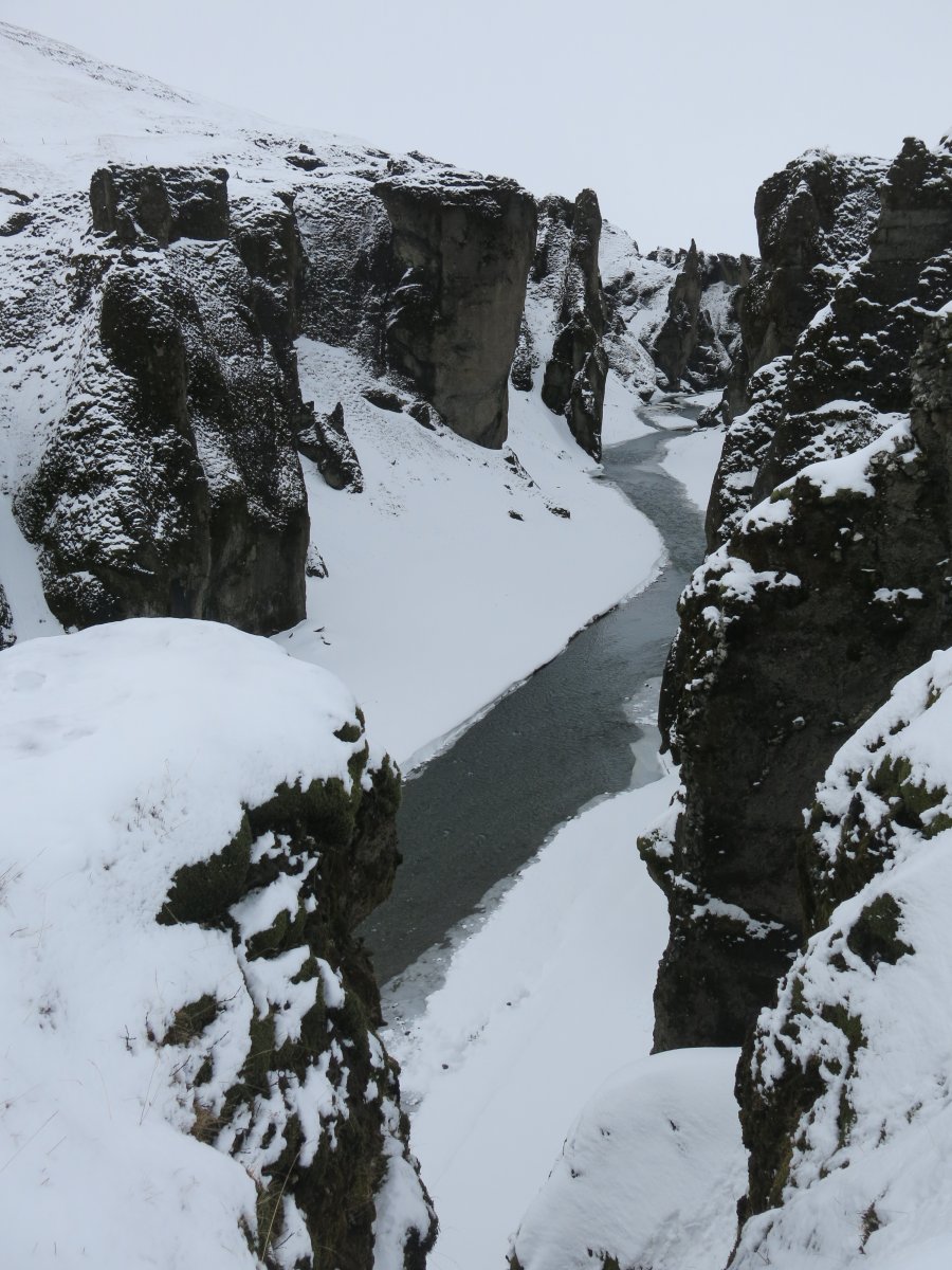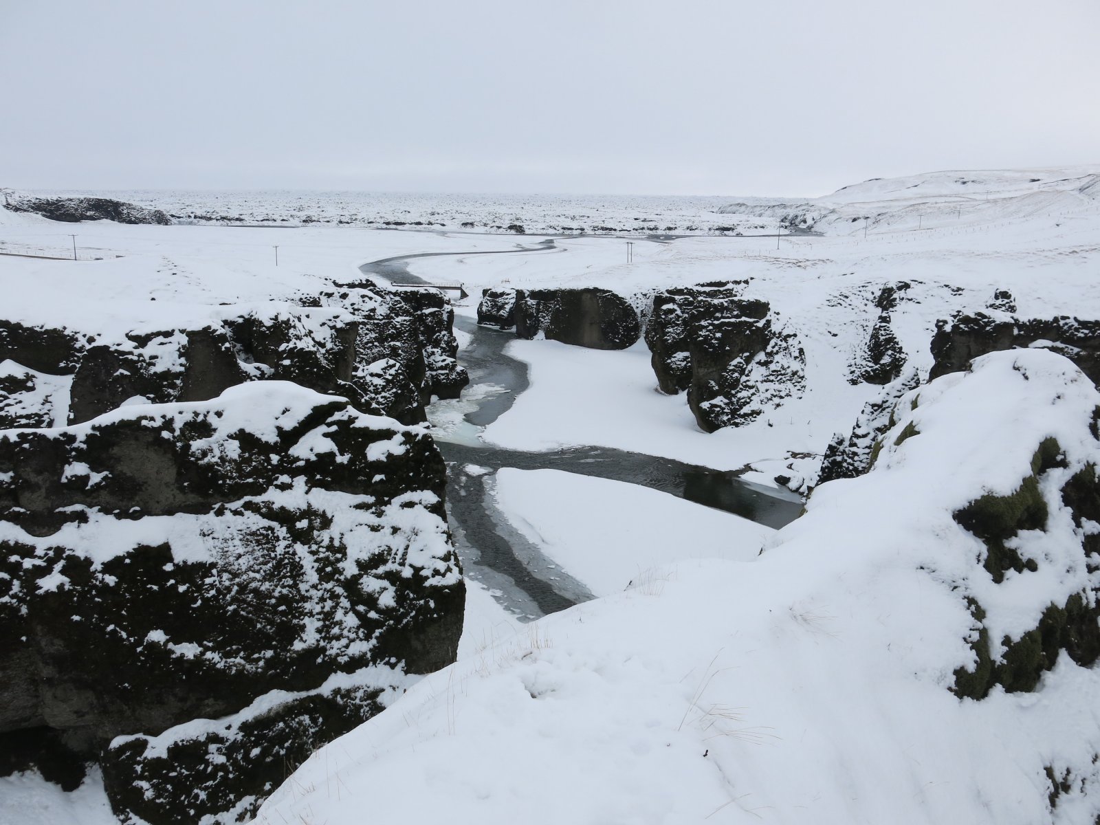 Ναι όμως δεν γινόταν να χάσουμε έτσι την μέρα. Μέχρι το μεσημέρι καθόμασταν μετά δεν μπορούσαμε άλλο. Τα εκχιονιστικά ελπίζαμε να είχαν κάνει καλή δουλειά. Όλη μέρα τα βλέπαμε πάνω κάτω. Λέμε να πάμε στο φαράγγι Fjadrargljufur που είναι σχετικά κοντά. Όσο ήμασταν στο Ring road δηλαδή τον κεντρικό που κάνει τον γύρο της Ισλανδίας (γνωστό και ως route 1) ο δρόμος ήταν καλός. Όταν στρίψαμε όμως στον παράδρομο που πάει για το φαράγγι δεν γινόταν να προχωρήσουμε πολύ. Αν είχαμε 4x4 θα μπορούσαμε να συνεχίσουμε. Βρίσκουμε έναν κύριο που καθαρίζει το δρόμο του σπιτιού του από τα χιόνια με τη δικιά του μπουλντόζα! Τον ρωτήσαμε αν μπορούσαμε να αφήσουμε το αυτοκίνητο σε αυτό το σημείο. Όχι τίποτε άλλο, μην μας το σκεπάσει και μετά δεν το βρίσκουμε. Μας είπε ότι είναι μια χαρά. Πολλοί Ισλανδοί είχαν δικά τους μέσα να καθαρίζουν τα σπίτια τους, οι περισσότεροι 'πειραγμένα' τρακτέρ με τσάπες. Ξεκινήσαμε να περπατάμε για περίπου 2 χλμ. Το θέαμα στο φαράγγι είναι γκεϊμοφθρονικό. Ιδού...