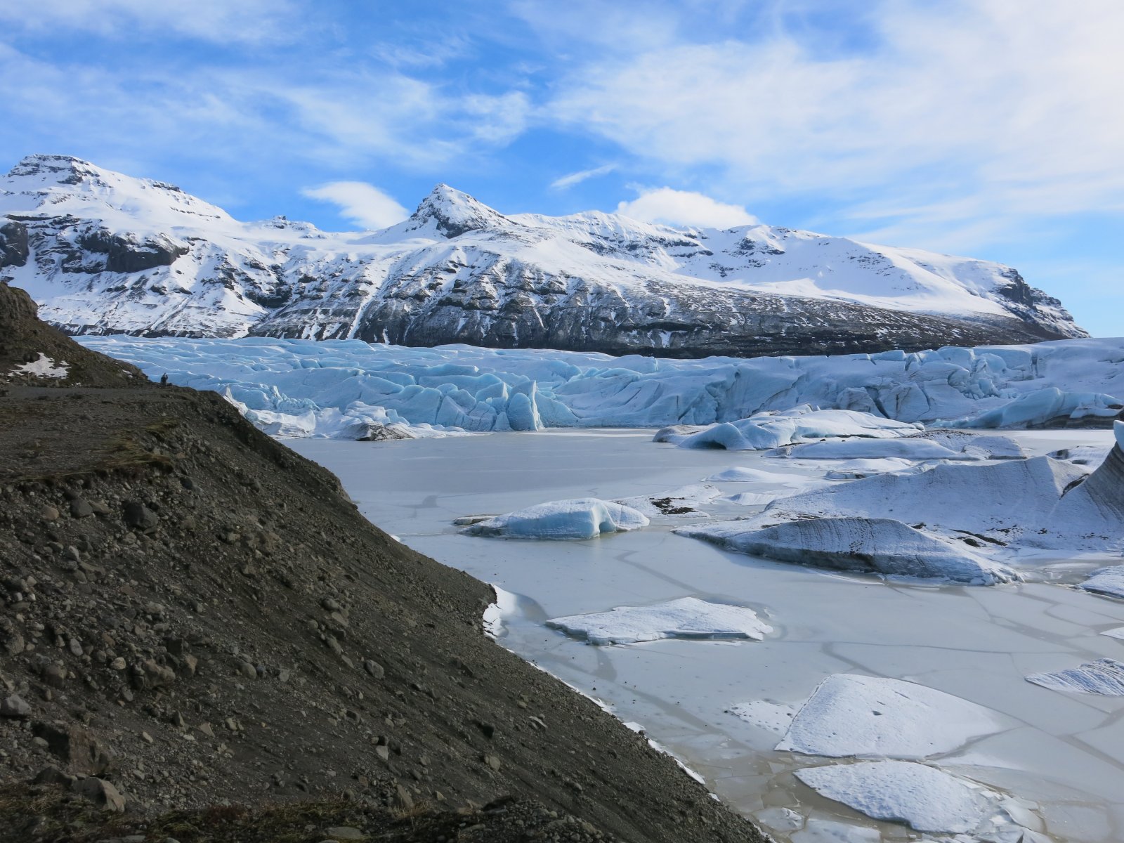 Σειρά έχει ο παγετώνας Svinafellsjokull. Λίγα χιλιόμετρα δίπλα. Εμείς πήγαμε με το αυτοκίνητο. Φτάσαμε στην γλώσσα του παγετώνα, δεν μπορέσαμε όμως να τον πατήσουμε.