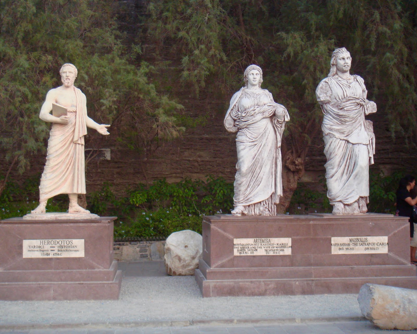 Αγάλματα του ιστορικού Ηρόδοτου (που η αρχαία Αλικαρνασσός είναι η γενέτειρα του), του πολύκροτου ζεύγους της εποχής Αρτεμισίας και Μαύσωλου, είναι εκτεθειμένα γύρω από τον εξωτερικό χώρο,