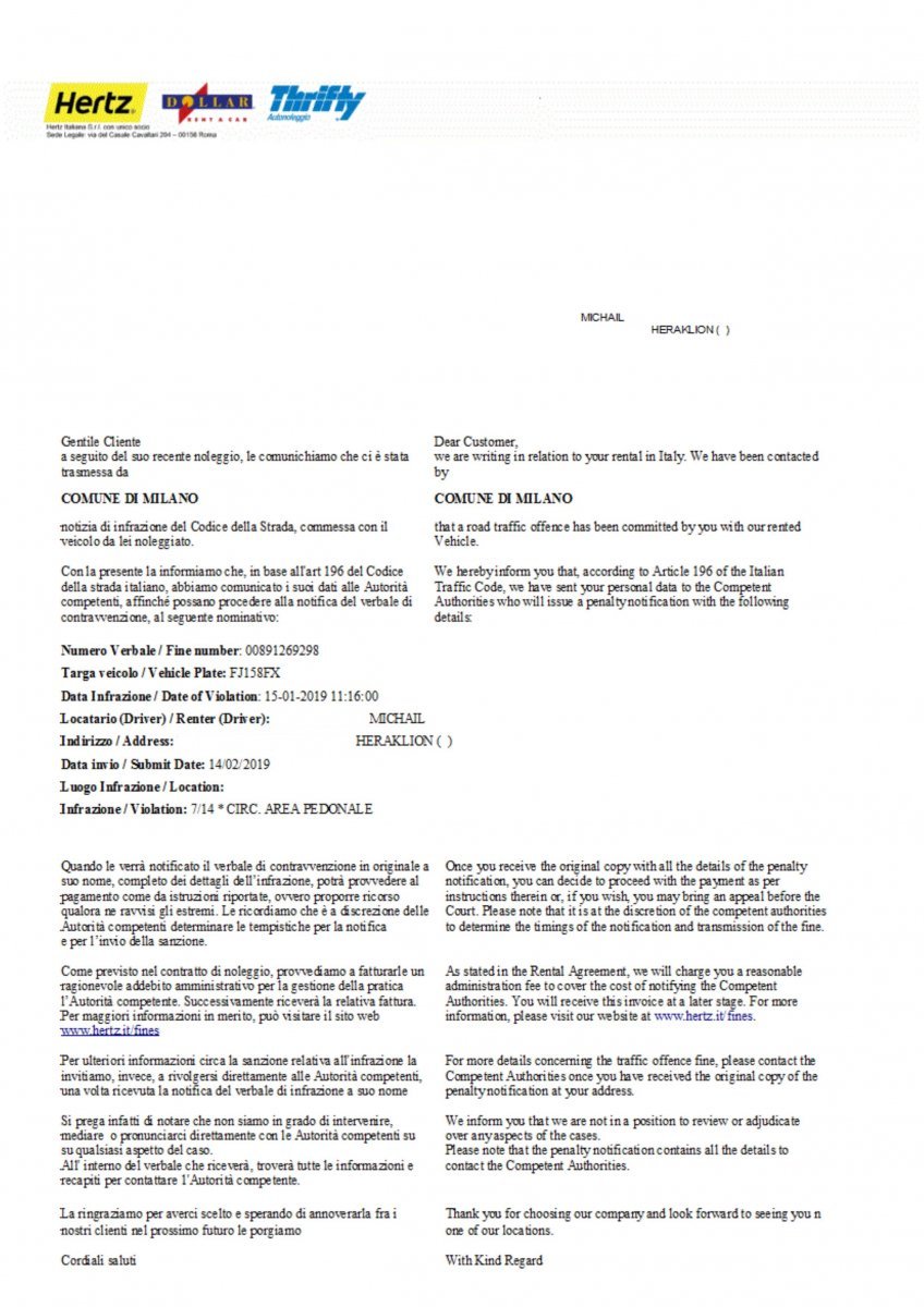 τον Γενάρη είχα πάει Ιταλία και είχα νοικιάσει αυτοκίνητο από την HERTZ.