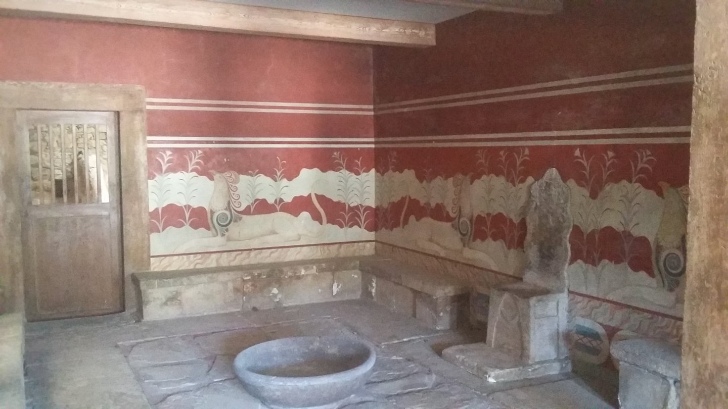 View attachment 141316 Ο θρονος απο αλαβαστρο πλαισιωνεται απο καθισματα ενω μπροστα του στη μεση της αιθουσας υπαρχει μια λεκανη απο πορφυριτη λιθο.Οι τοιχογραφιες απεικονιζουν γρυπες,φανταστικα οντα,με κεφαλι αετου σωμα λιονταριου και ουρα φιδιου χωρις φτερα για να μενουν παντα διπλα στον βασιλια και ειναι συμβολα βασιλικης και θεικης εξουσιας.Το καθισμα του προεδρου του διεθνους δικαστηριου της Χαγης ειναι ξυλινο αντιγραφο του αλαβαστρινου θρονου της Κνωσσου.