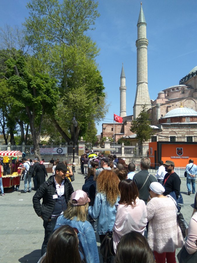 Η πόλη μας περίμενε με καλοκαιρινό καιρό και αφού ξεπεράσαμε την καθυστέρηση με το βαν και την οδήγηση καμικάζι του Τούρκου φτάσαμε στο ξενοδοχείο για να αφήσουμε πράγματα και να ξεχυθούμε στους δρόμους. Πρώτη μας στάση ένα ανταλλακτήριο για να κάνουμε συνάλλαγμα και αμέσως Αγιά Σοφιά. Οι ουρές όπως θα δείτε και στις φωτογραφίες είναι μεγάλες και για όσους δεν έχουν πάει η είσοδος κοστίζει 40 λίρες (10 ευρώ περίπου).