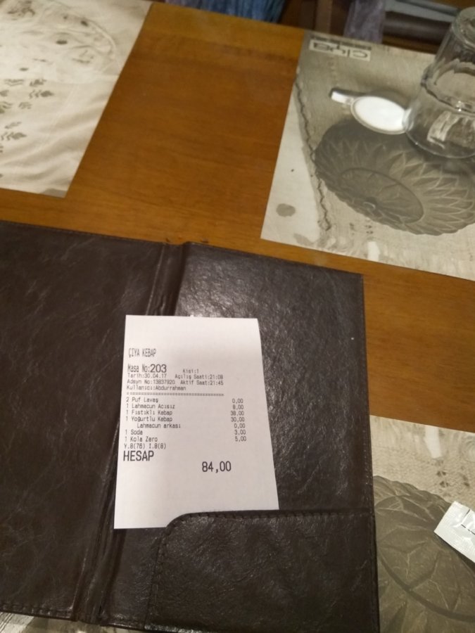 Μόλις φτάσαμε έξω από το μαγαζί έπρεπε να διαλέξουμε ανάμεσα στο Ciya sofrasi που είχε και μαγειρευτά και το Ciya kebap που είχα φάει ξανά στην προηγούμενη επίσκεψη μου στην πόλη. Τελικά προτιμήσαμε την δοκιμασμένη συνταγή που μας αποζημίωσε για άλλη μια φορά.