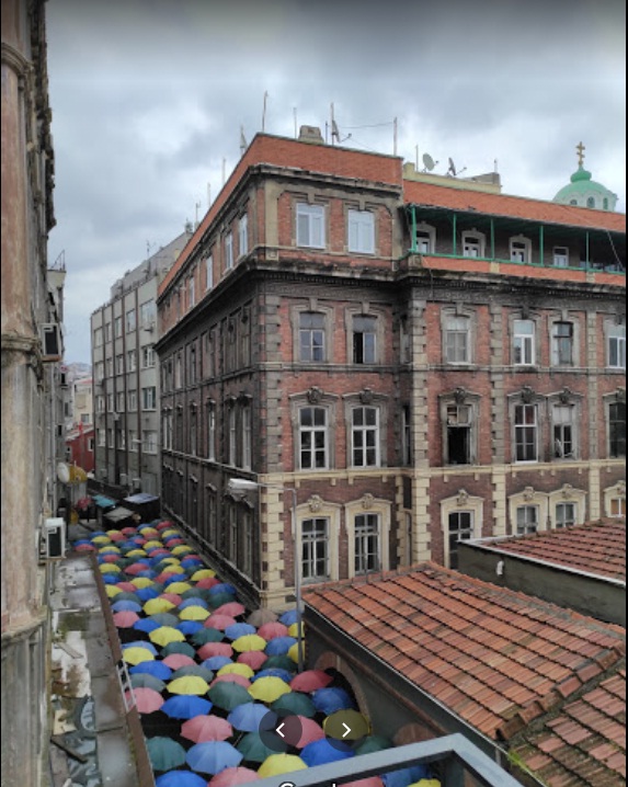 Στη φωτογραφία τώρα που έβαλες, φαίνεται κάτω δεξιά ο υφαρπαγμένος από τους τουρκορθόδοξους ναός του Αγίου Νικολάου -κλειστός πλέον και σε κακή κατάσταση- και, απέναντι το μεγάλο χανι ανήκει στη ρωσική εκκλησία, και έχει το εκκλησάκι του Αγίου Παντελεήμονα στην ταράτσα του. Αν βρεθείς εκεί, κάνε τον κόπο και ανέβα μέχρι επάνω. Το χανι αυτό είχε κελιά όπου έμεναν προπολεμικα οι Ρώσοι προσκυνητές που κατευθυνόταν στο Άγιο όρος και έκαναν στάση στην Κωνσταντινούπολη. Τώρα κάποιες οικογένειες ρωσων μένουν σε μερικά από αυτά ενώ άλλα νοικιαζονται σε γραφεία, όπως αυτό της εκδοτικής εταιρίας istos, που ανήκει σε ρωμιους και εκδίδει ελληνικού ενδιαφέροντος ή ελληνικά βιβλία στην τουρκική, αλλά και ομογενειακού ενδιαφέροντος στα ελληνικά..